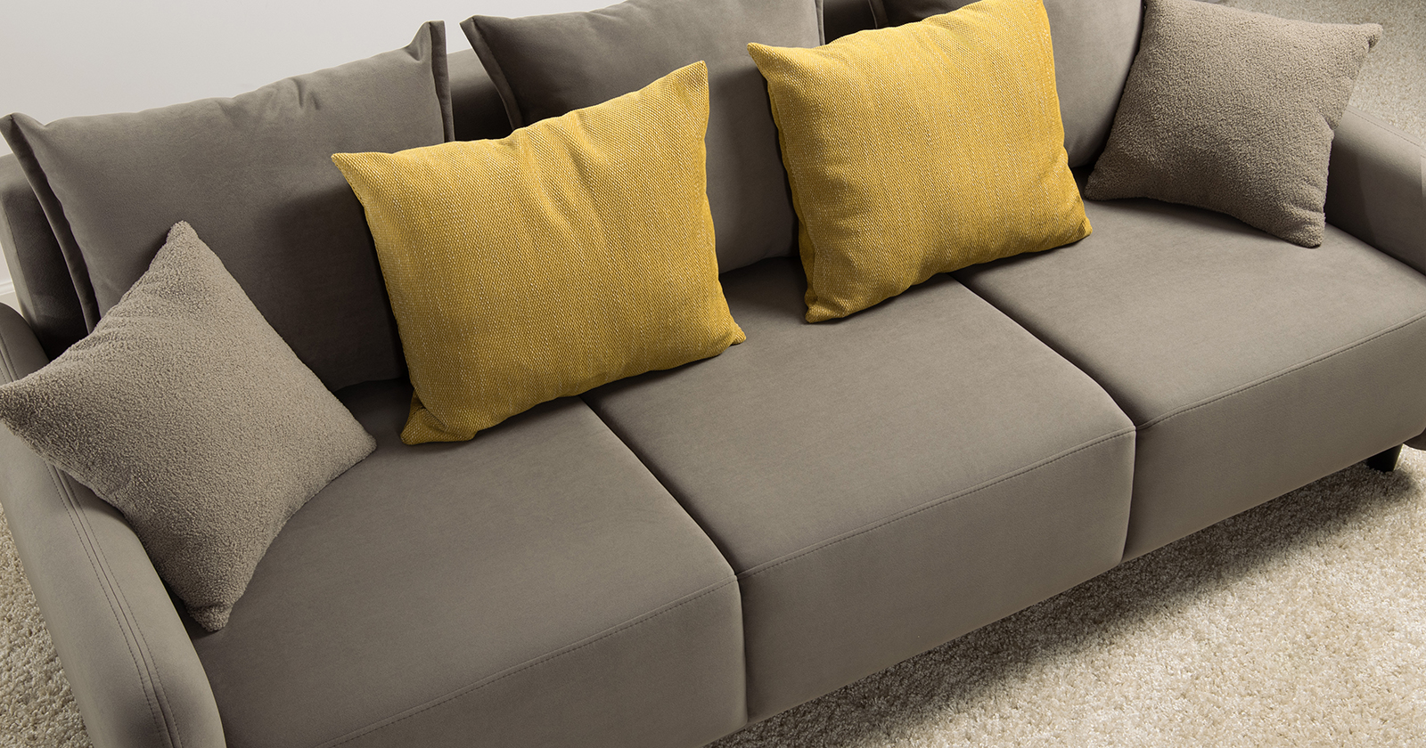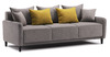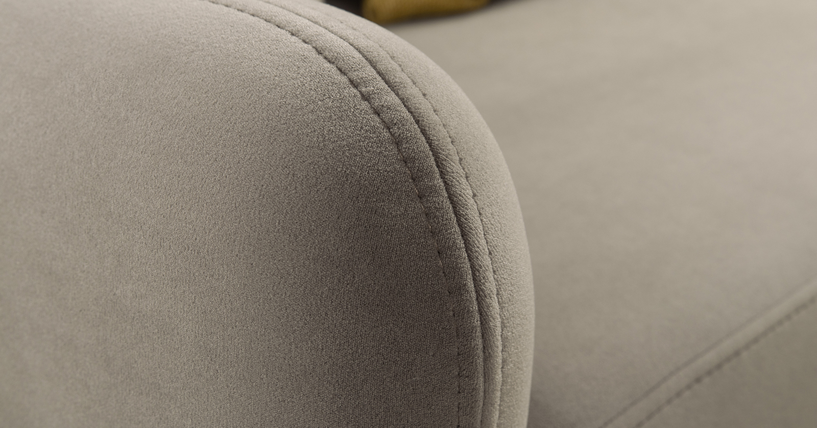 В комплекте 5 двусторонних приспинных подушки и 2 декоративные думки. Задняя спинка в ткани основы. Декоративные отделочные строчки по боковинам и сиденью