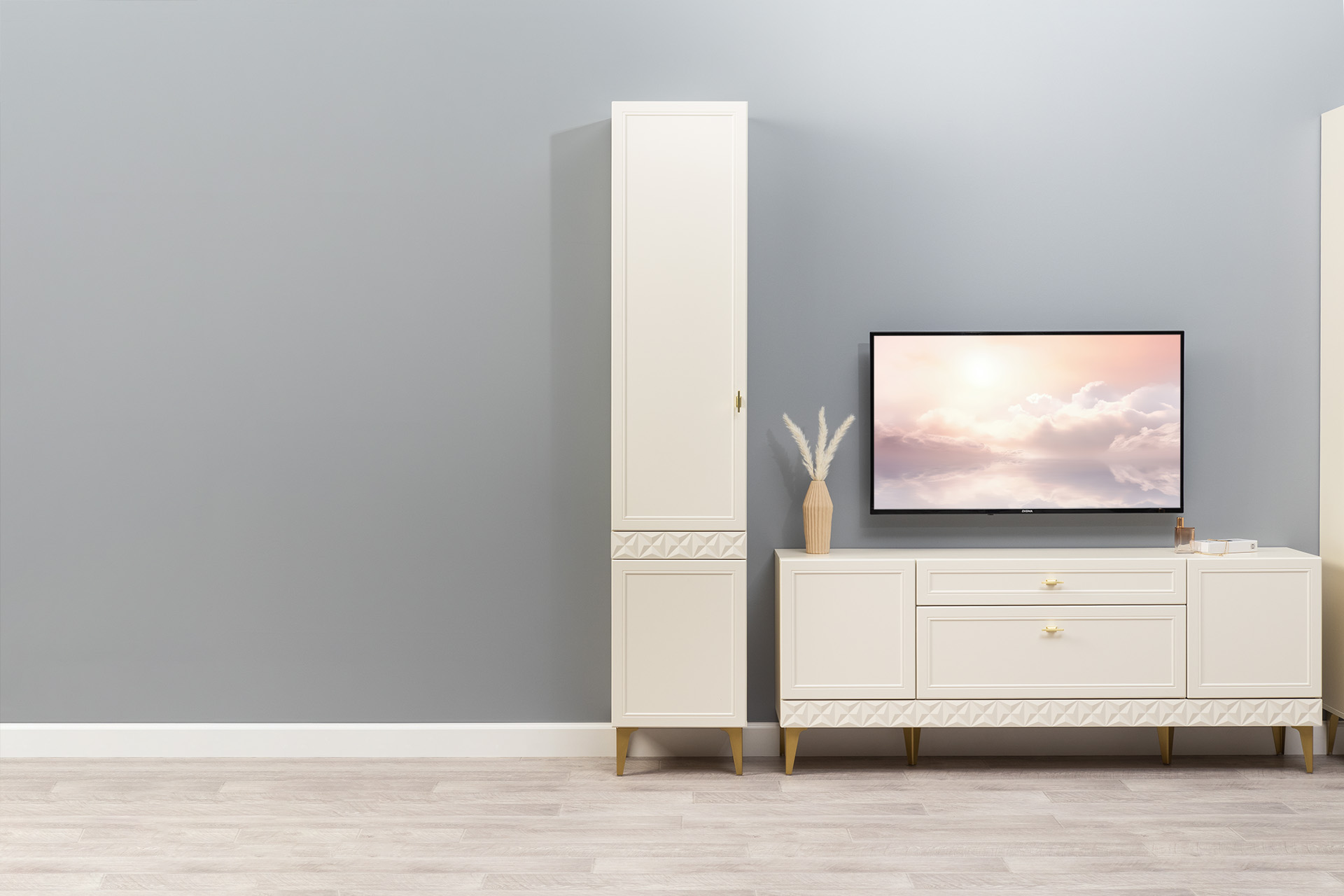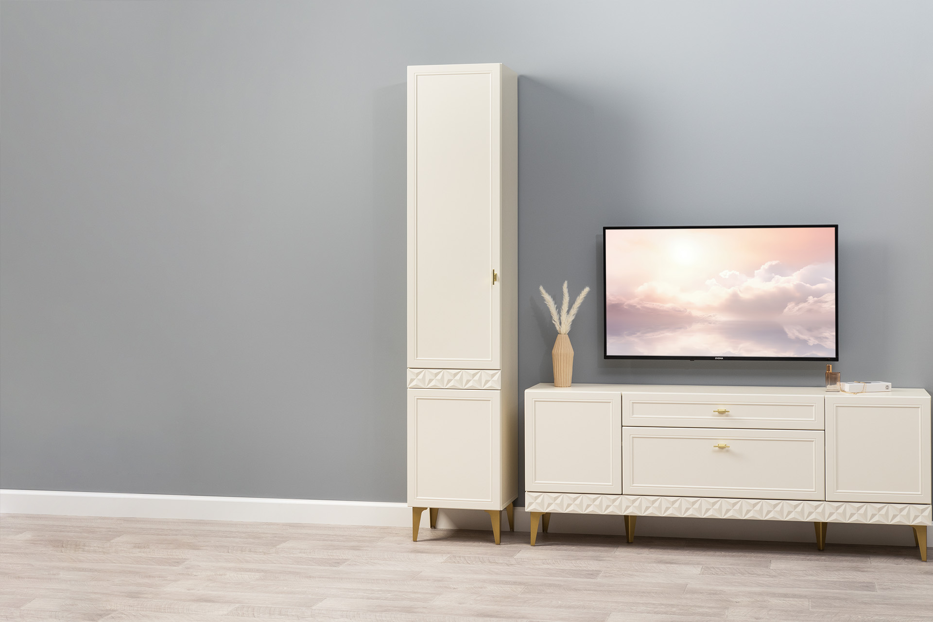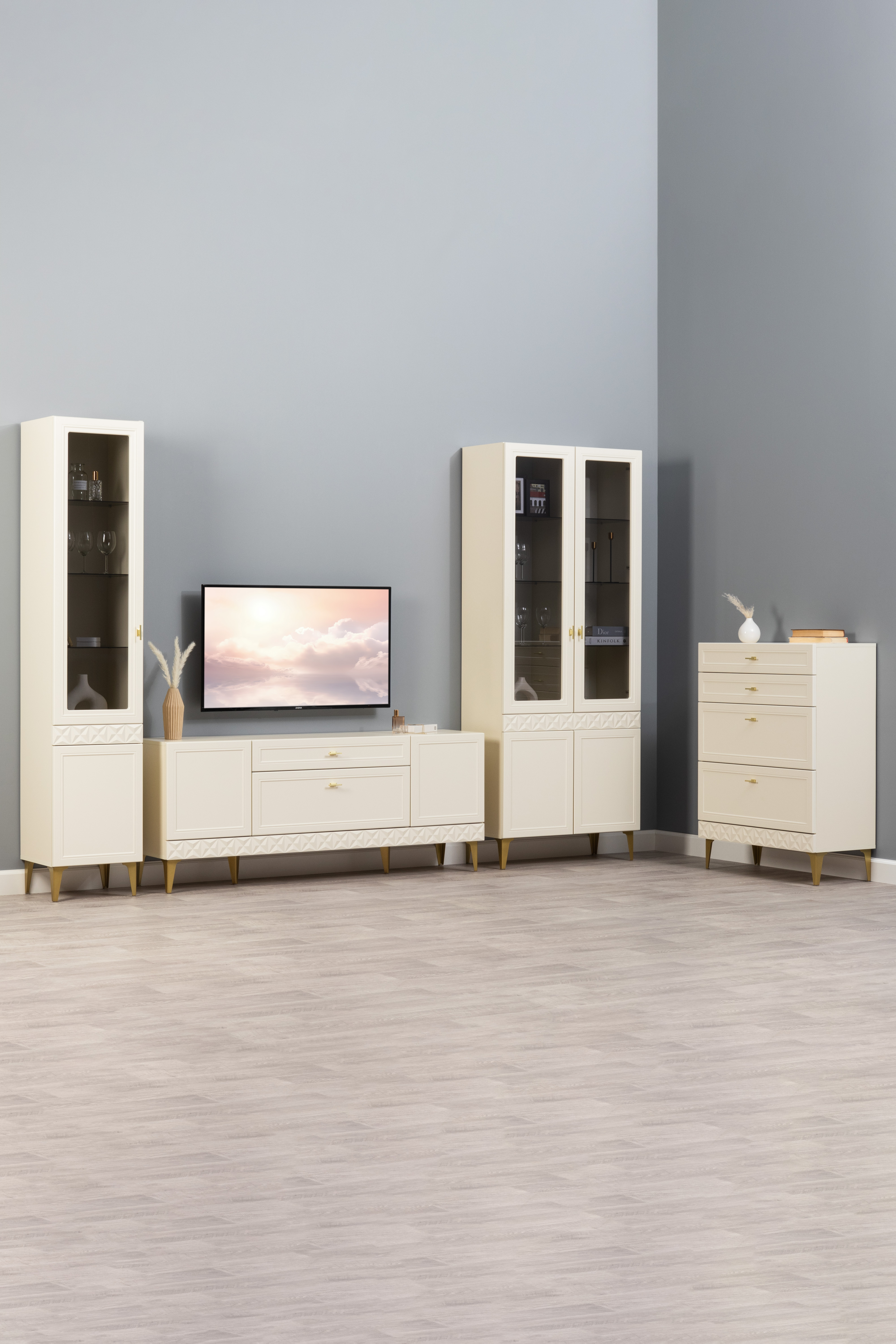Гостиная Марион композиция 2 слоновая кость С341 PE, слоновая кость 6898 ПВХ, белый PE шагрень (собирается на любую сторону)