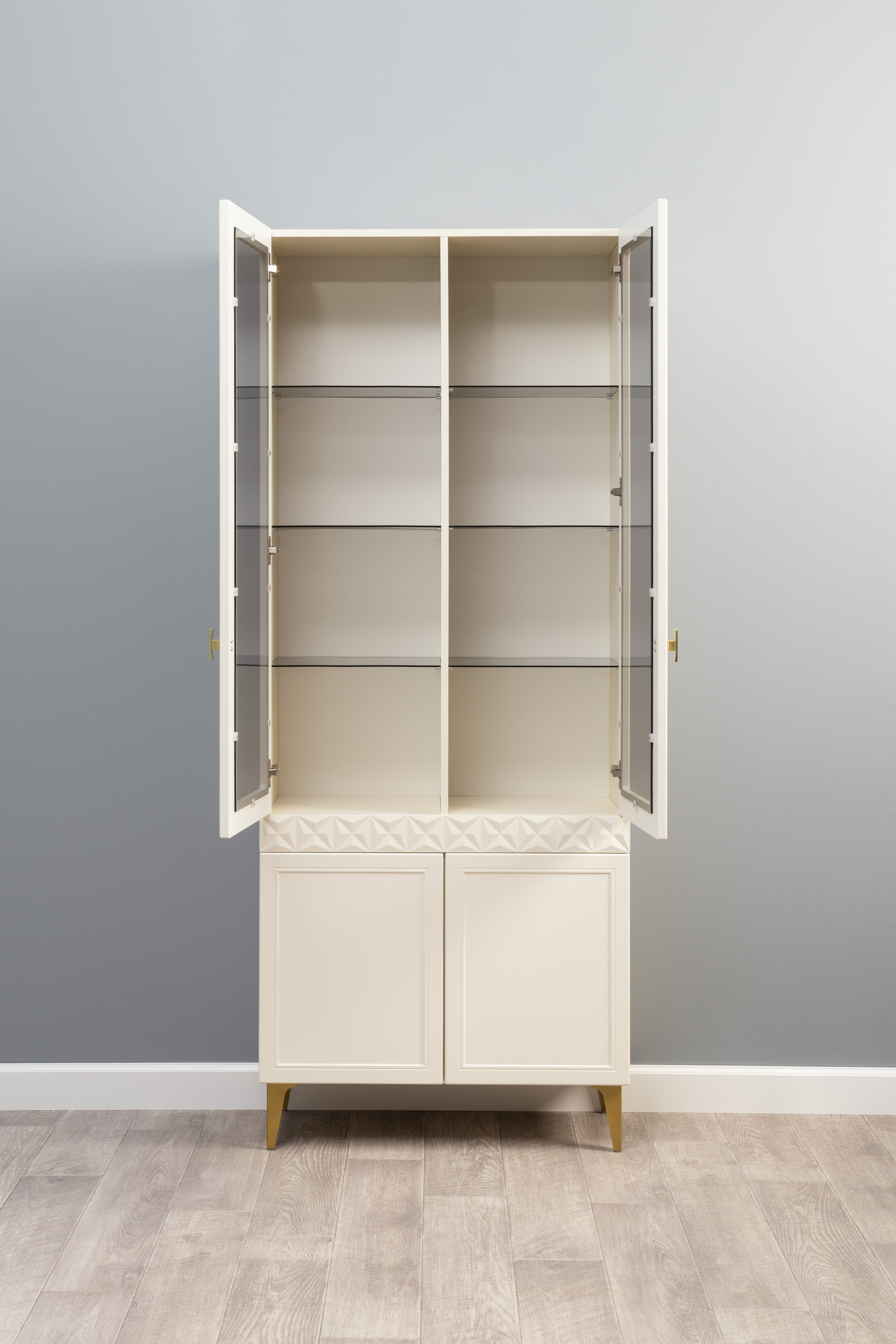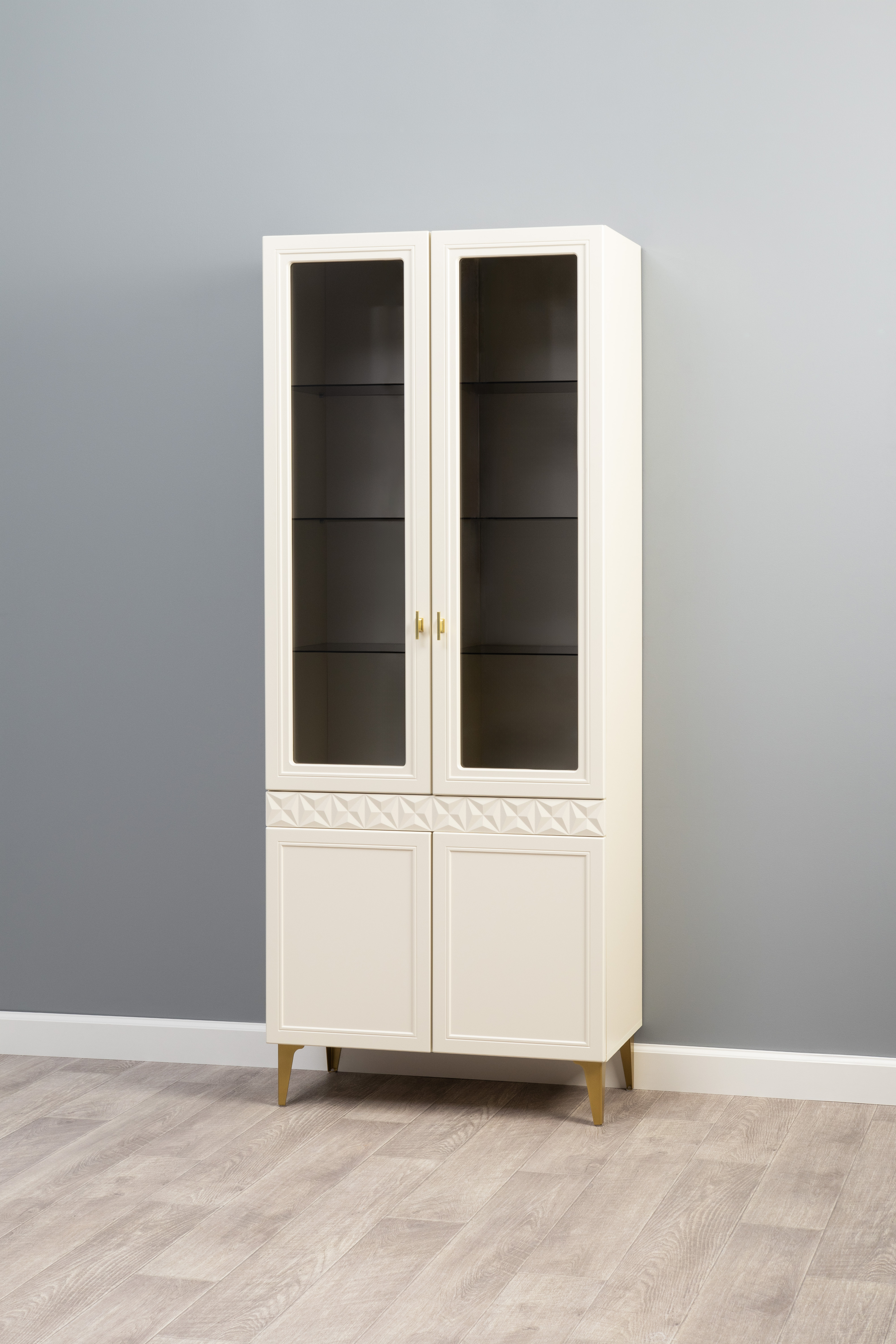 Шкаф-витрина Марион 16.397.01 слоновая кость С341 PE, слоновая кость 6898 ПВХ (собирается на любую сторону)
