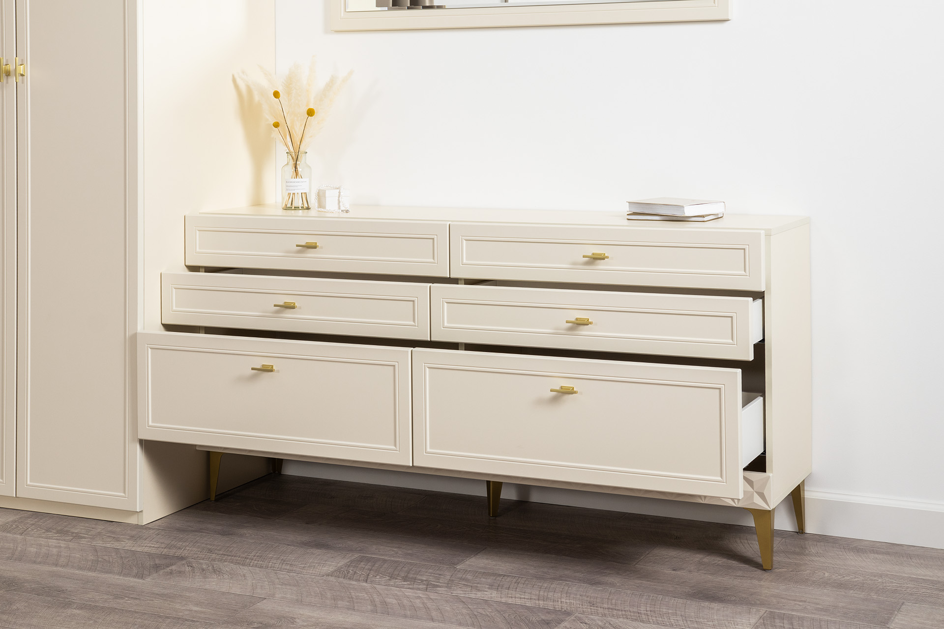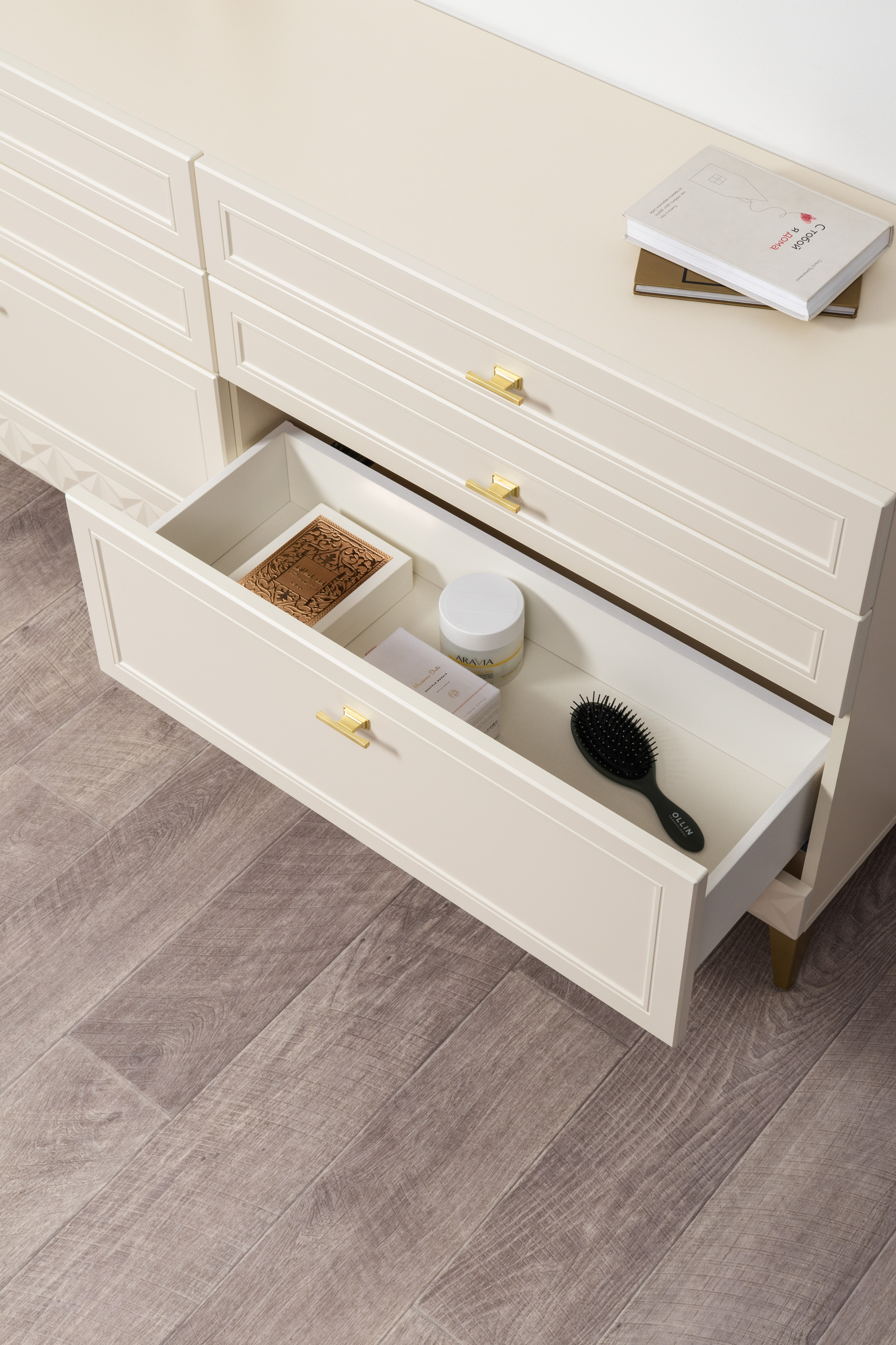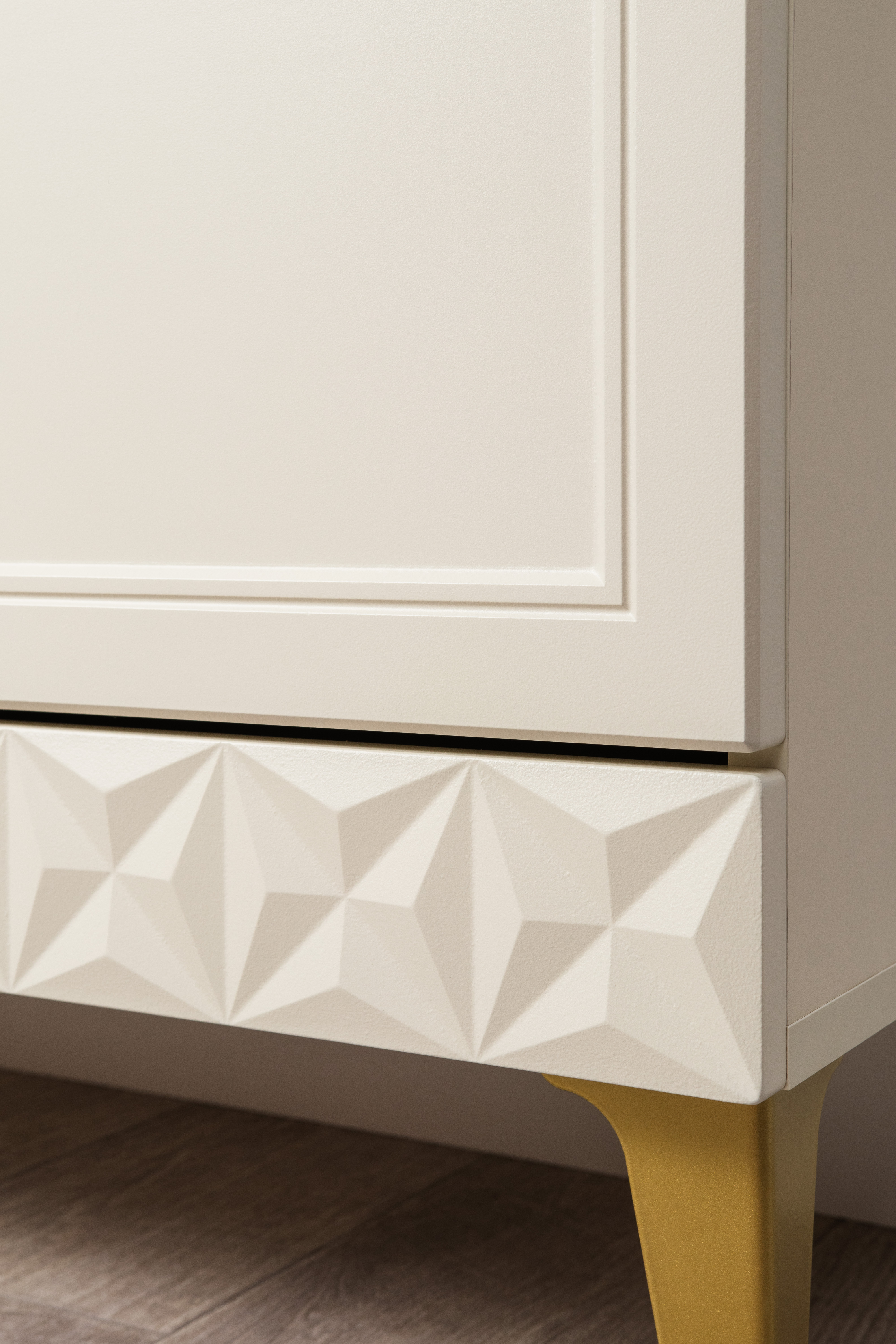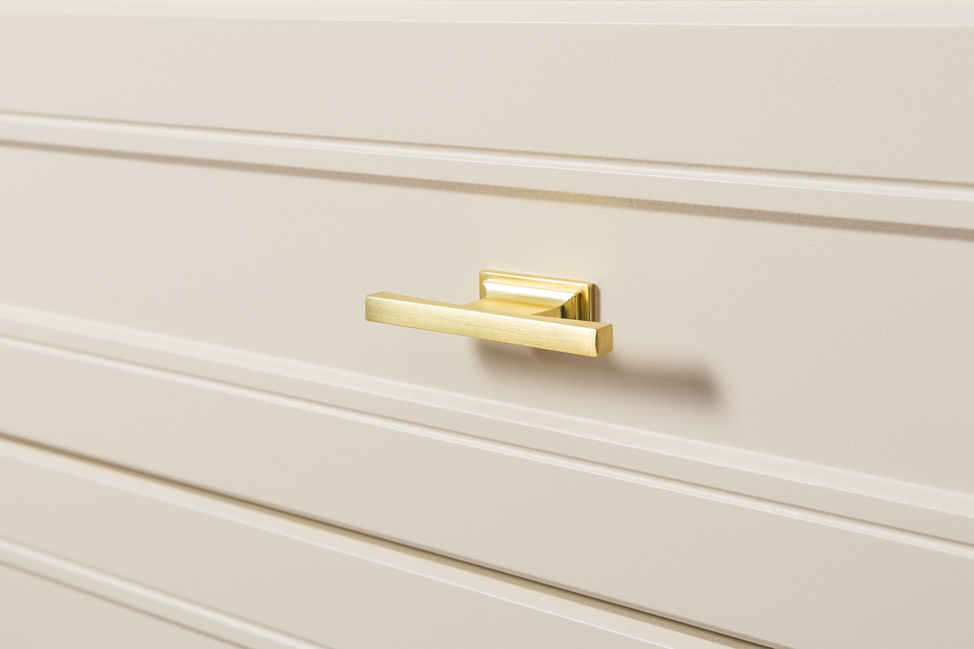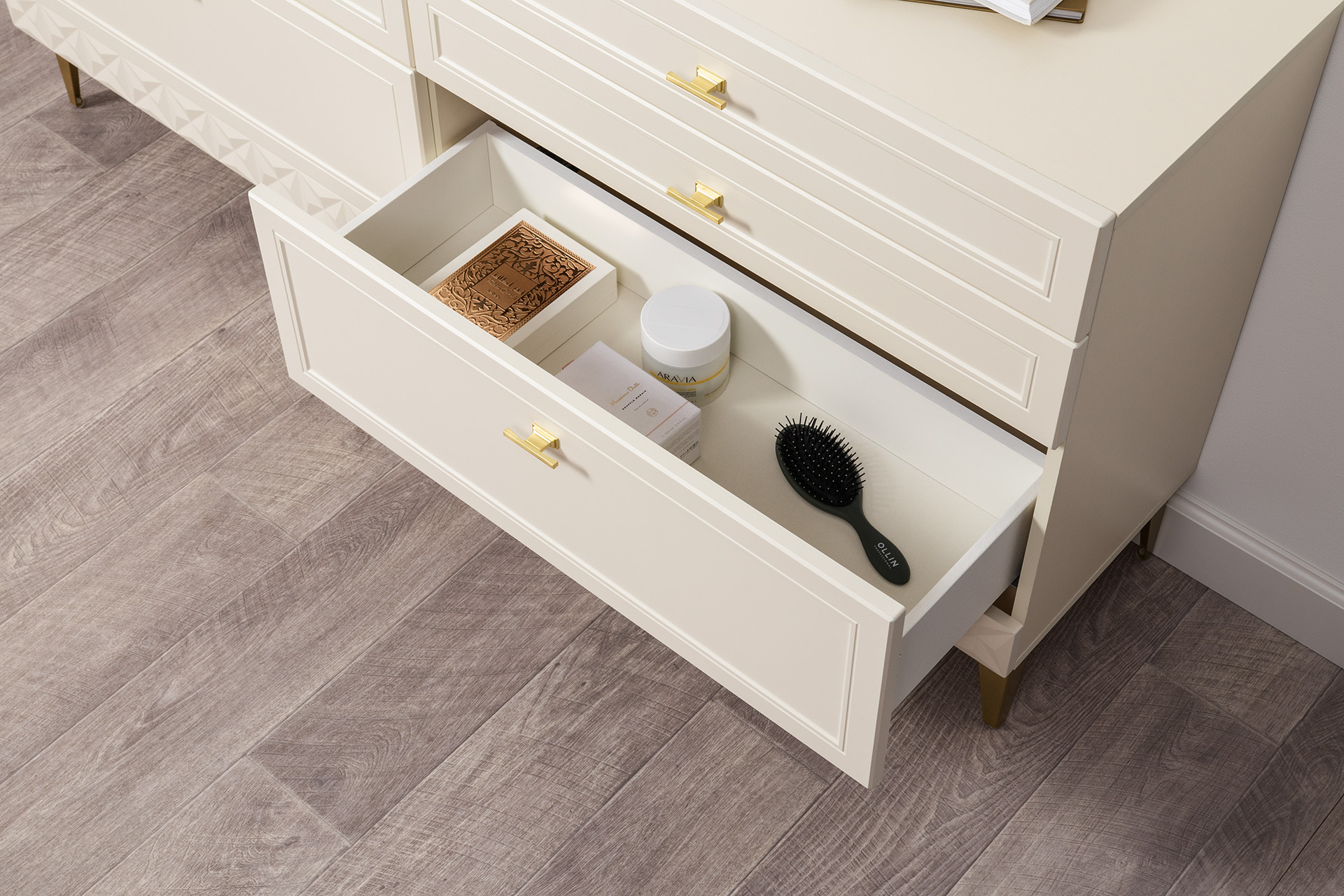 Изящные линии, глубокая фрезеровка фасадов из МДФ и благородные оттенки. Утончённая «Слоновая кость» и изысканная «Олива Шагрень» с глубоким зелёным тоном — создают атмосферу уюта, тепла и благородства. Металлические ручки и опоры золотого цвета придают мебели утончённый блеск, а петли и направляющие с доводчиками обеспечивают плавное и бесшумное закрытие фасадов.