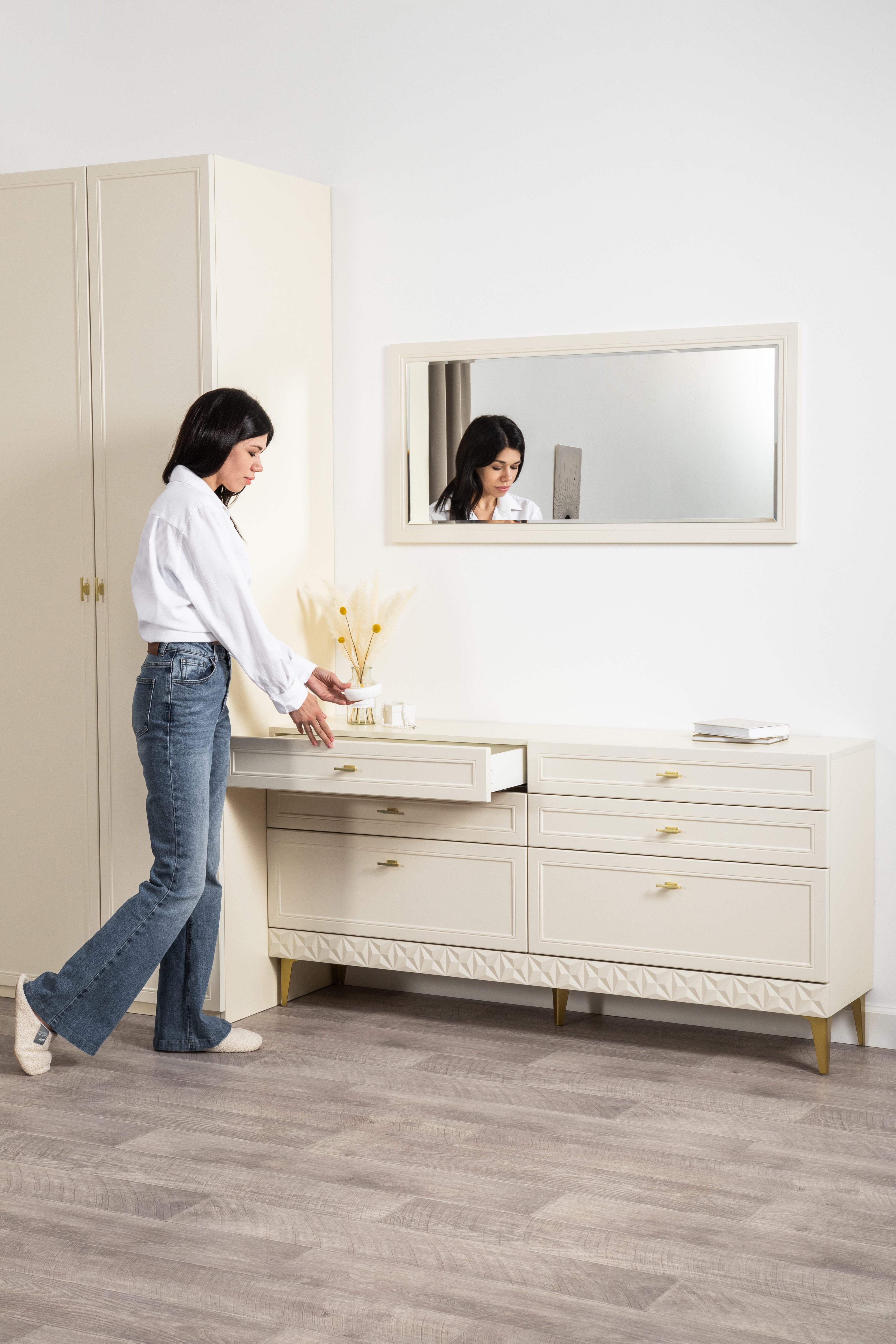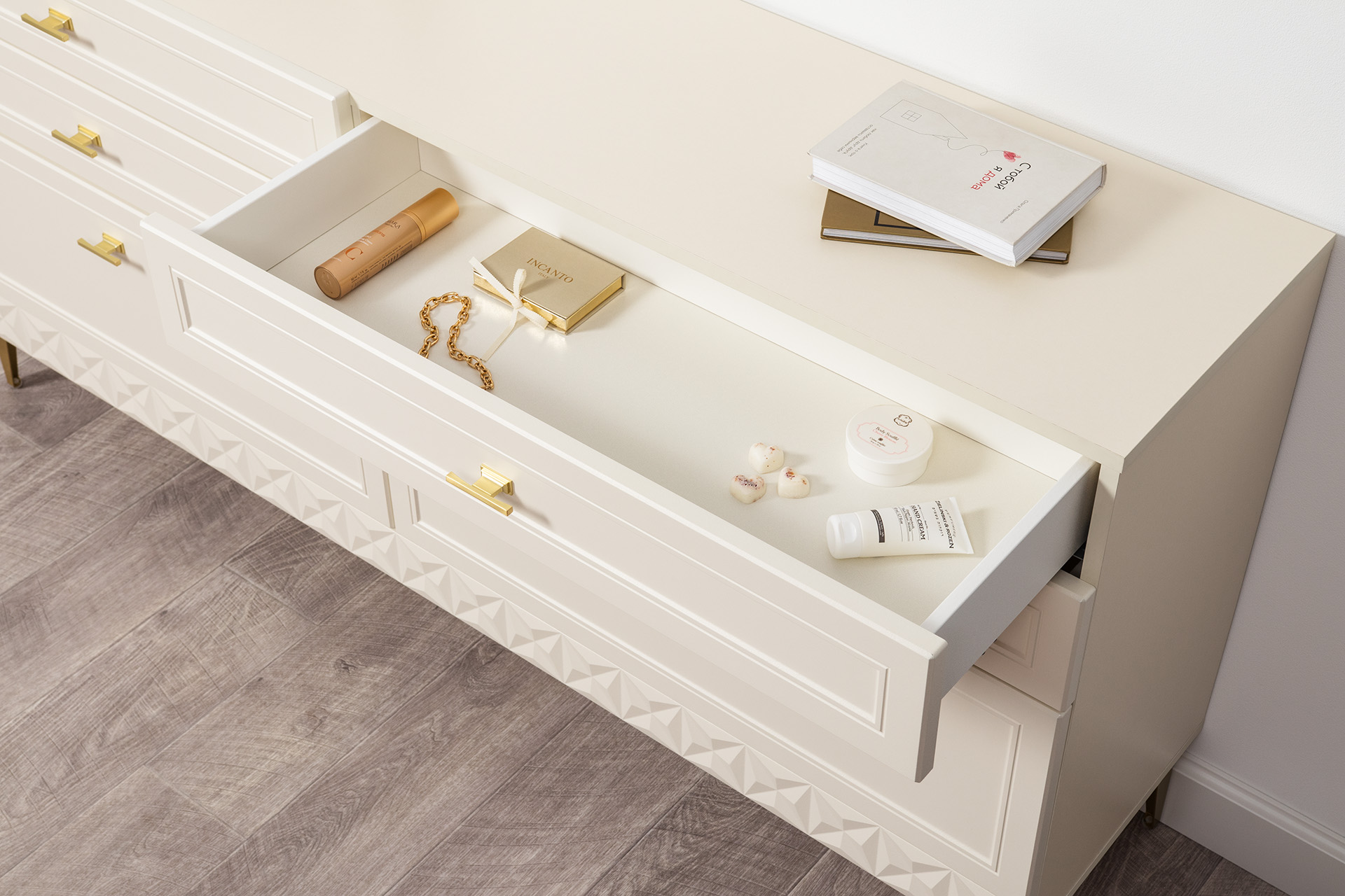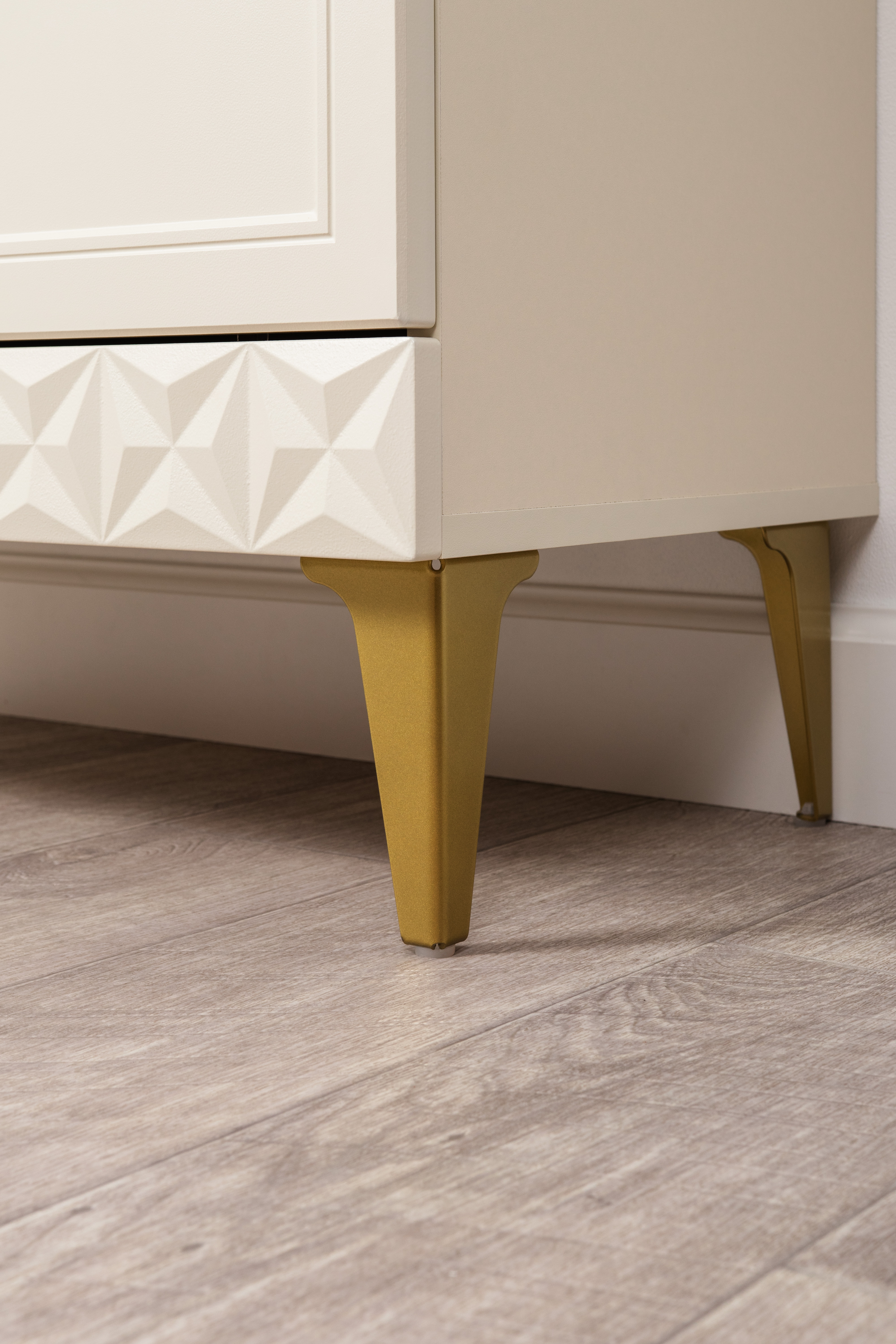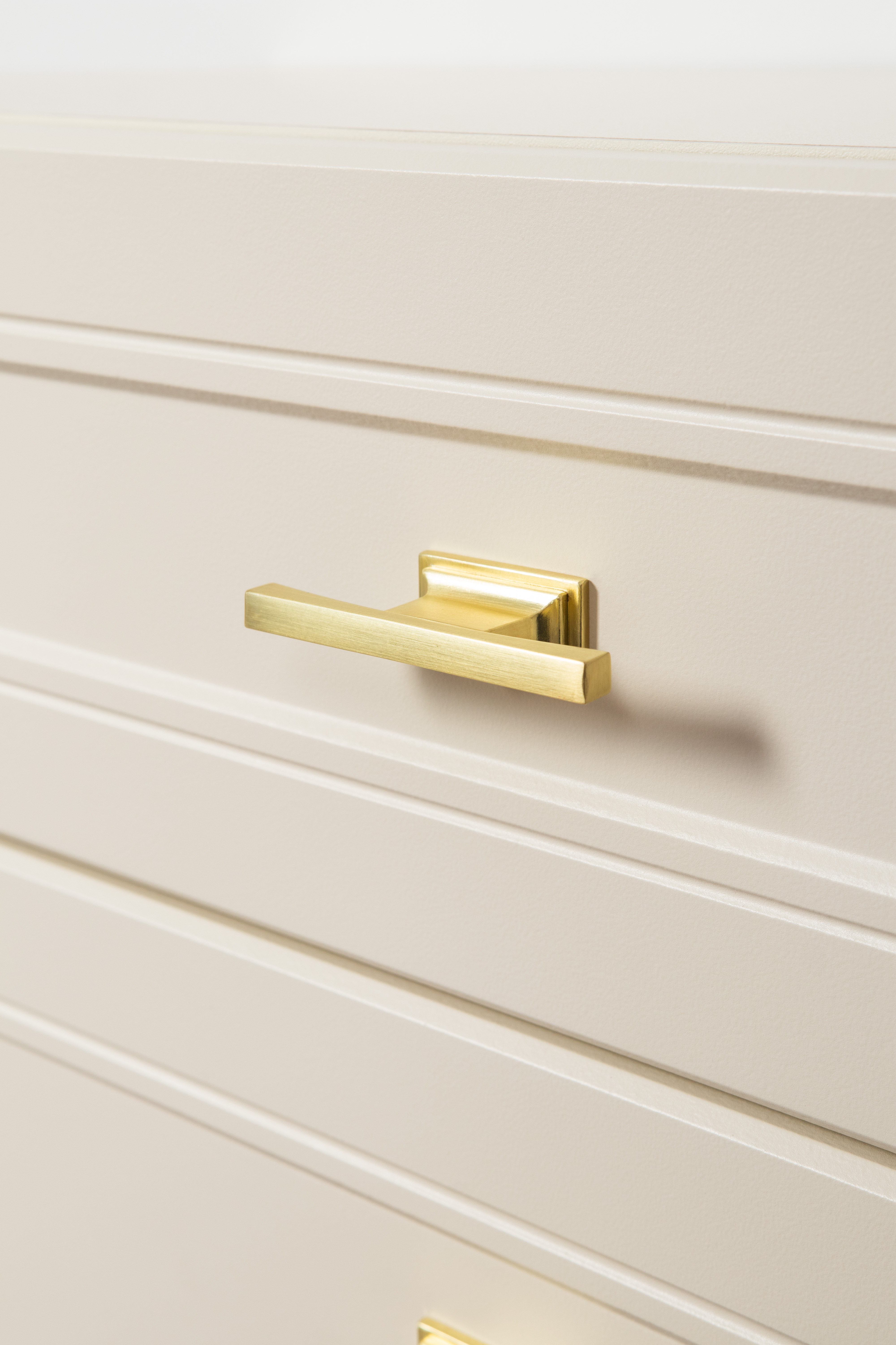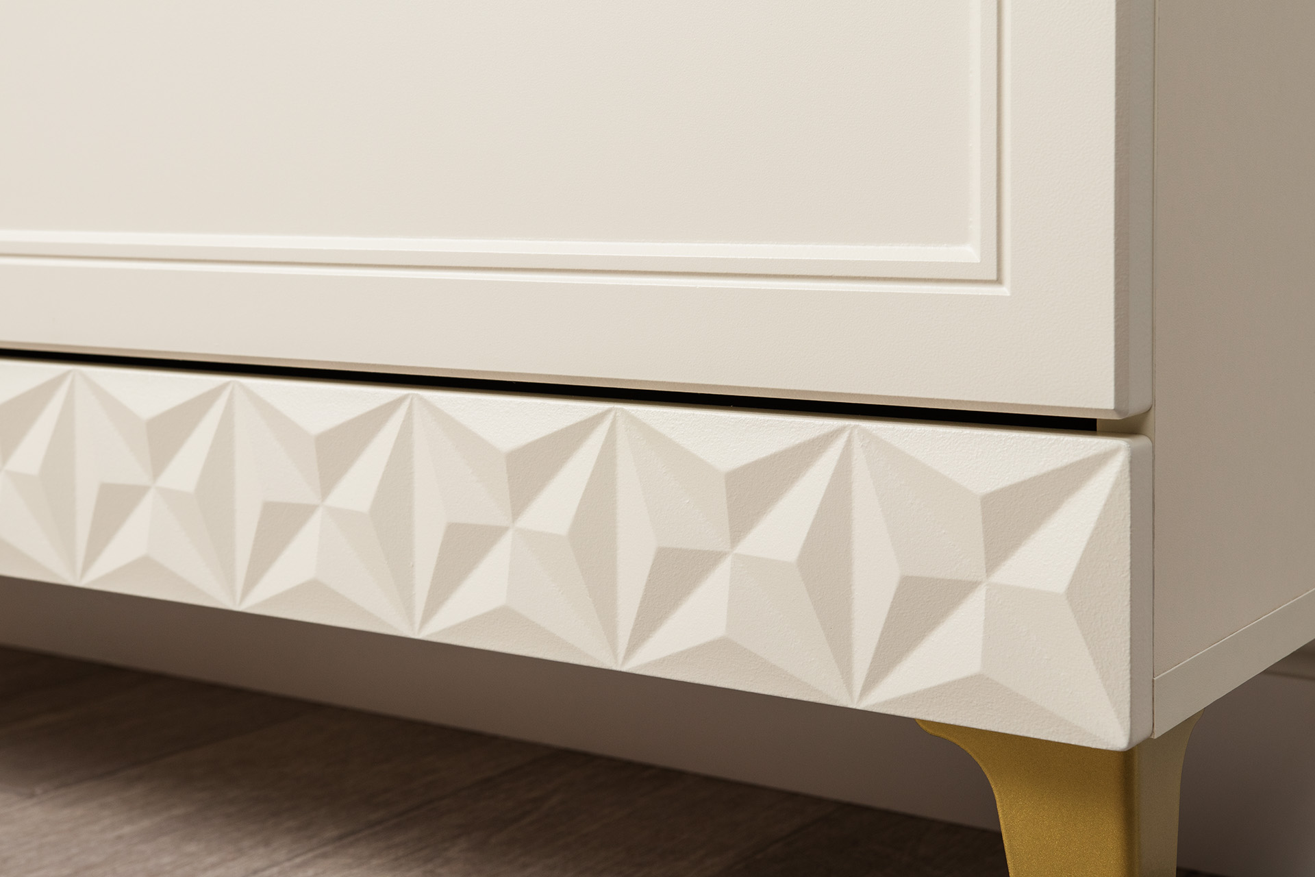 Изящные линии, глубокая фрезеровка фасадов из МДФ и благородные оттенки. Утончённая «Слоновая кость» и изысканная «Олива Шагрень» с глубоким зелёным тоном — создают атмосферу уюта, тепла и благородства. Металлические ручки и опоры золотого цвета придают мебели утончённый блеск, а петли и направляющие с доводчиками обеспечивают плавное и бесшумное закрытие фасадов.