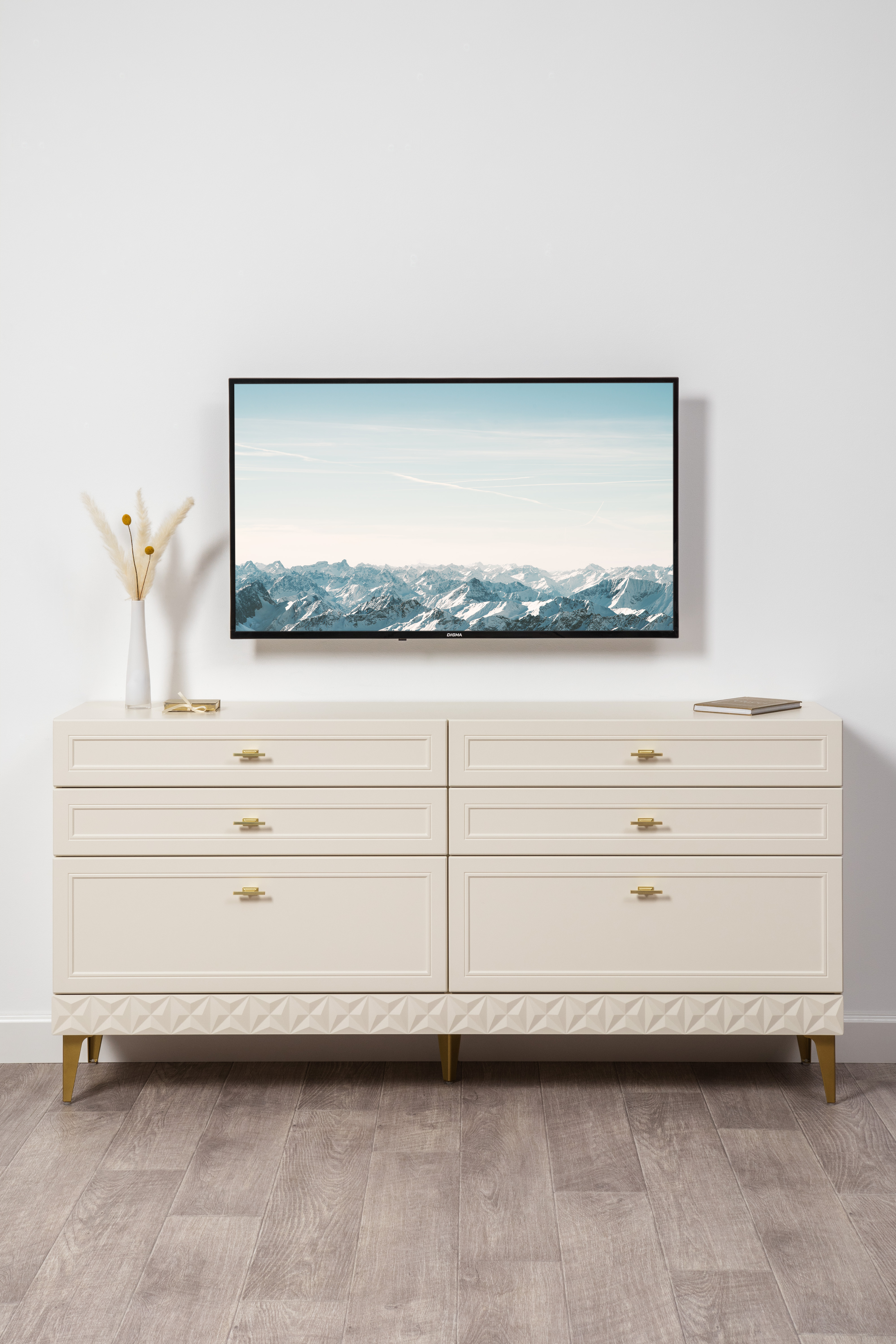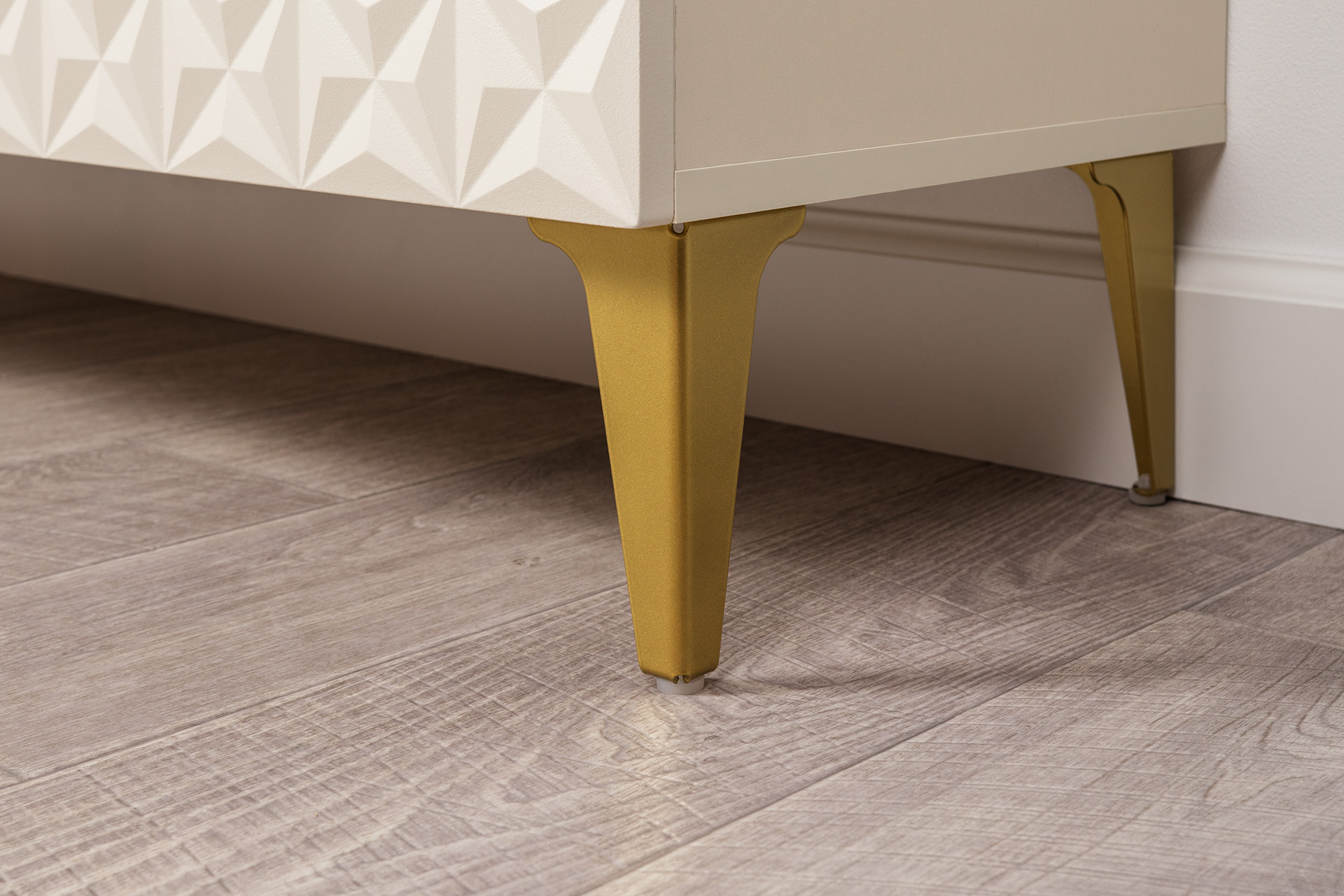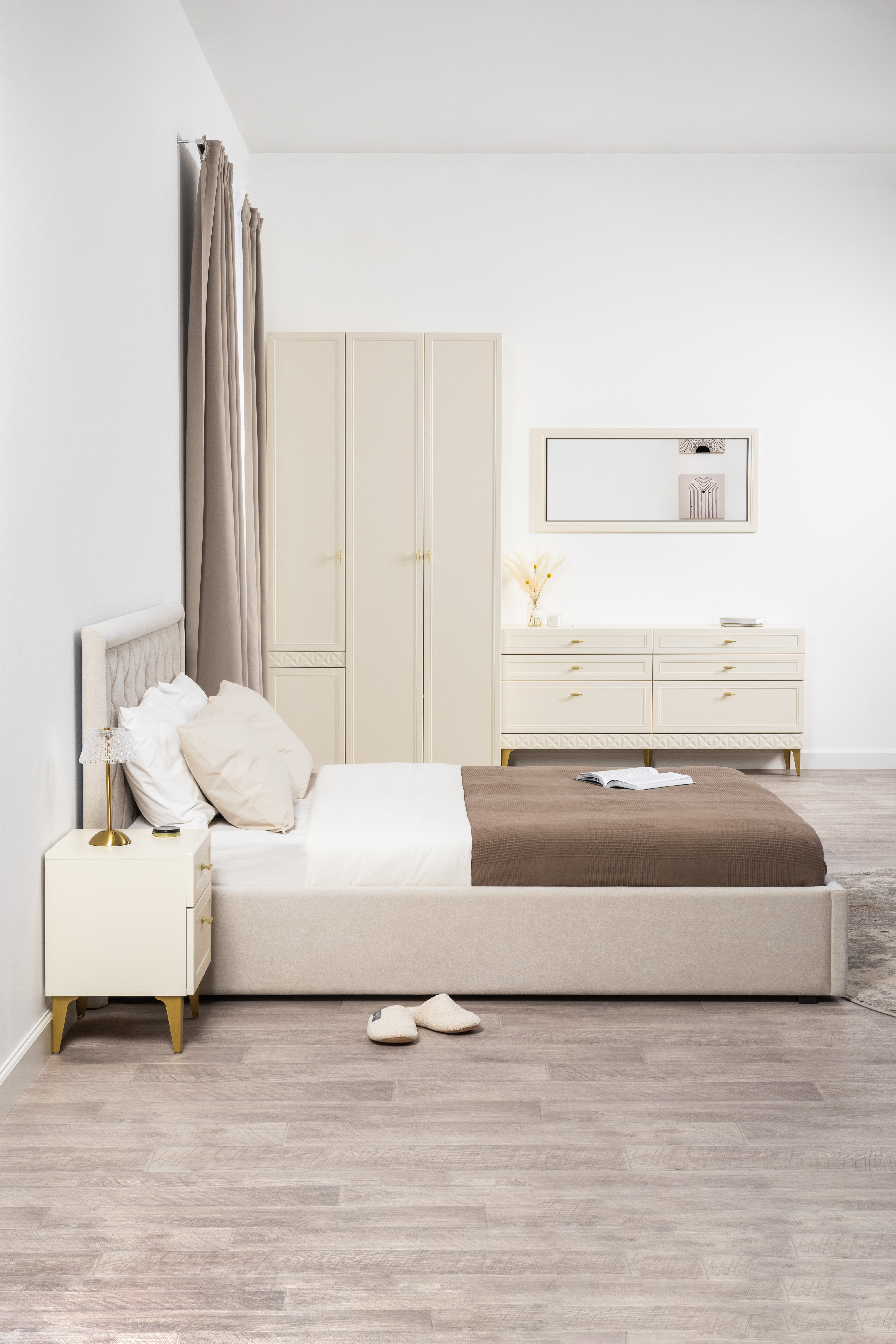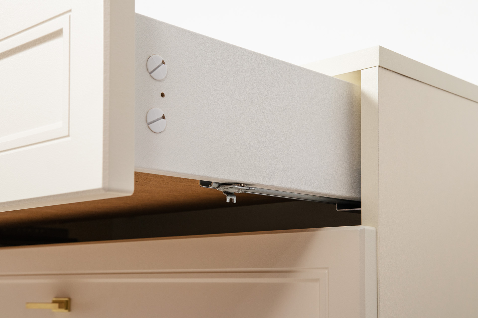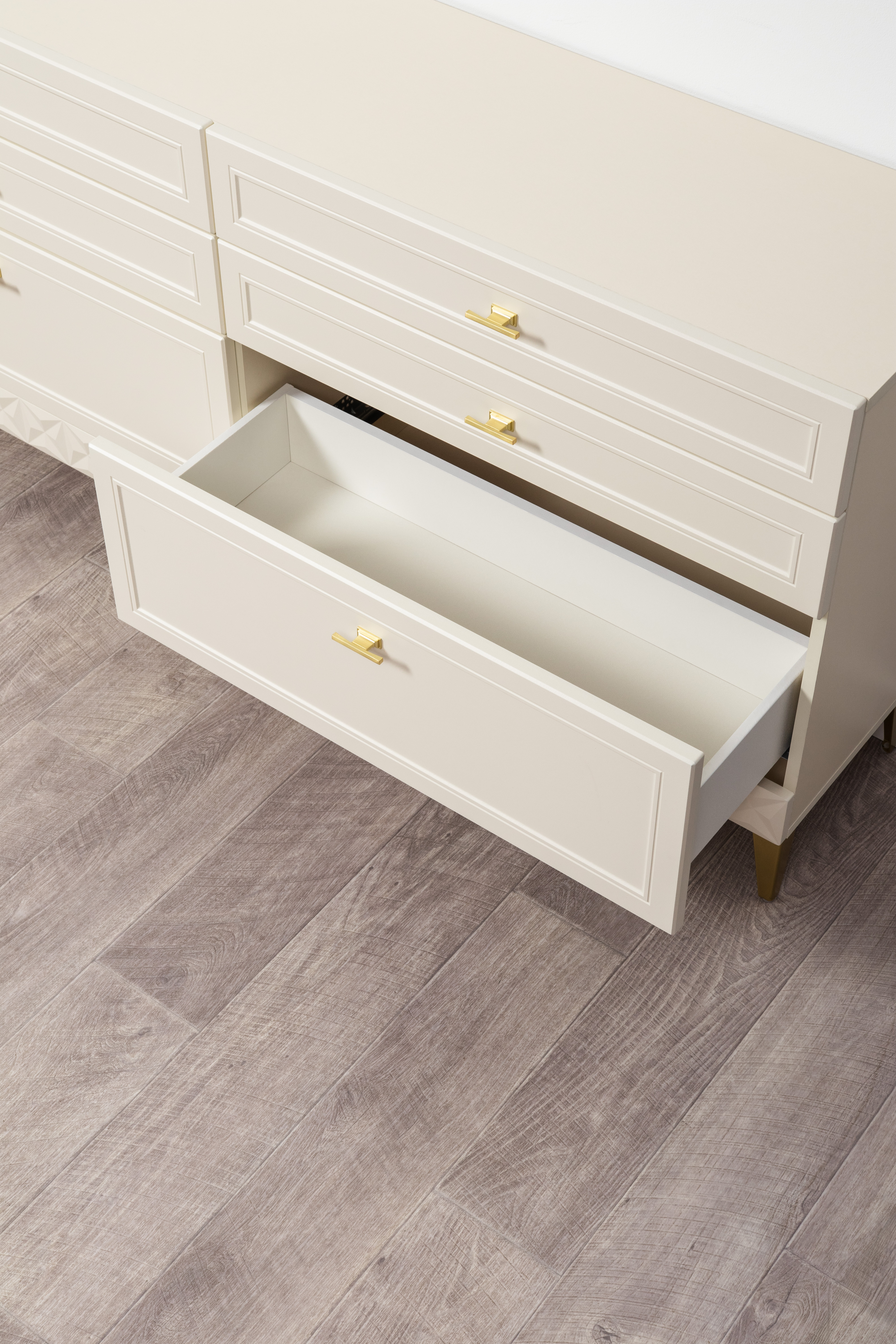 Изящные линии, глубокая фрезеровка фасадов из МДФ и благородные оттенки. Утончённая «Слоновая кость» и изысканная «Олива Шагрень» с глубоким зелёным тоном — создают атмосферу уюта, тепла и благородства. Металлические ручки и опоры золотого цвета придают мебели утончённый блеск, а петли и направляющие с доводчиками обеспечивают плавное и бесшумное закрытие фасадов.