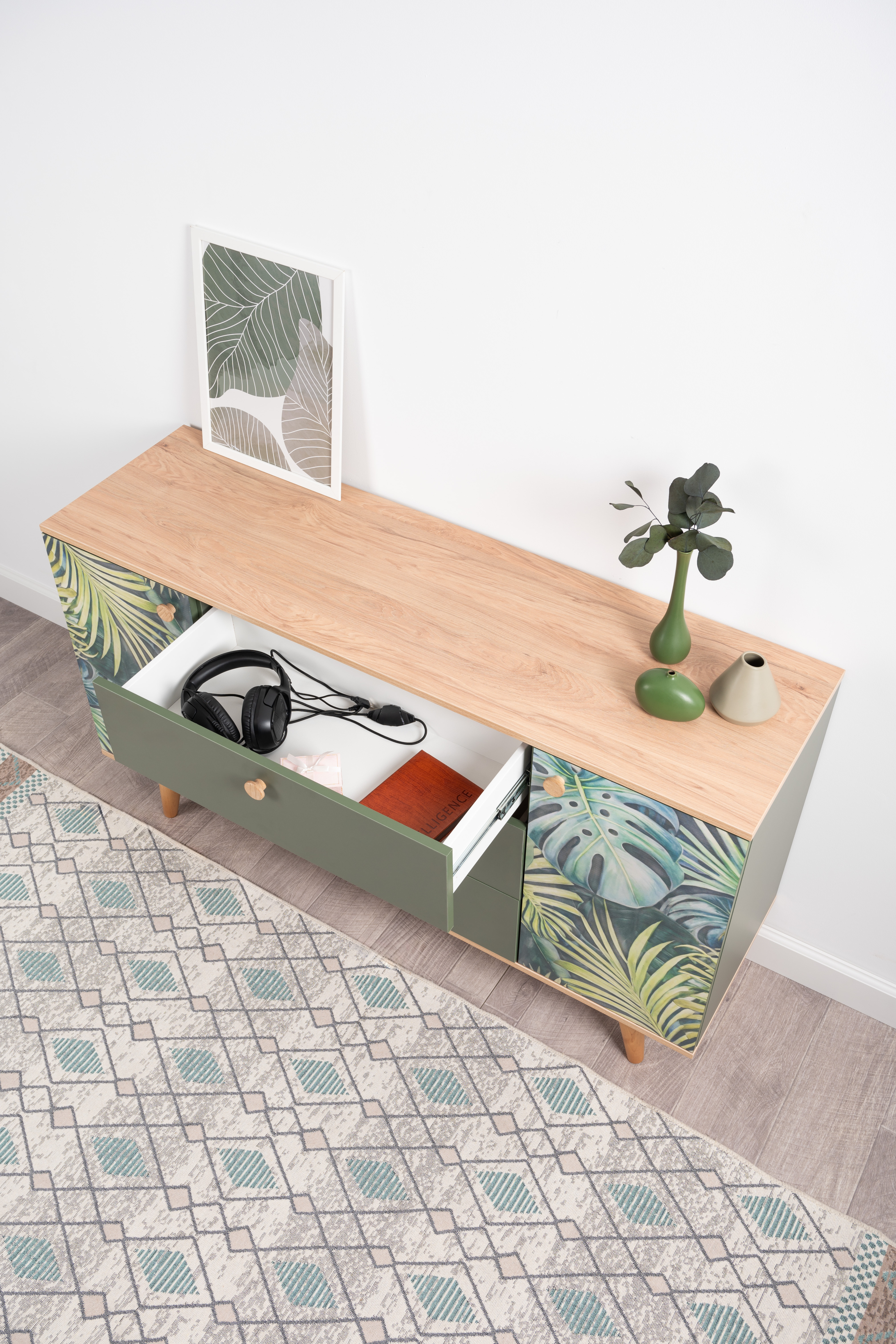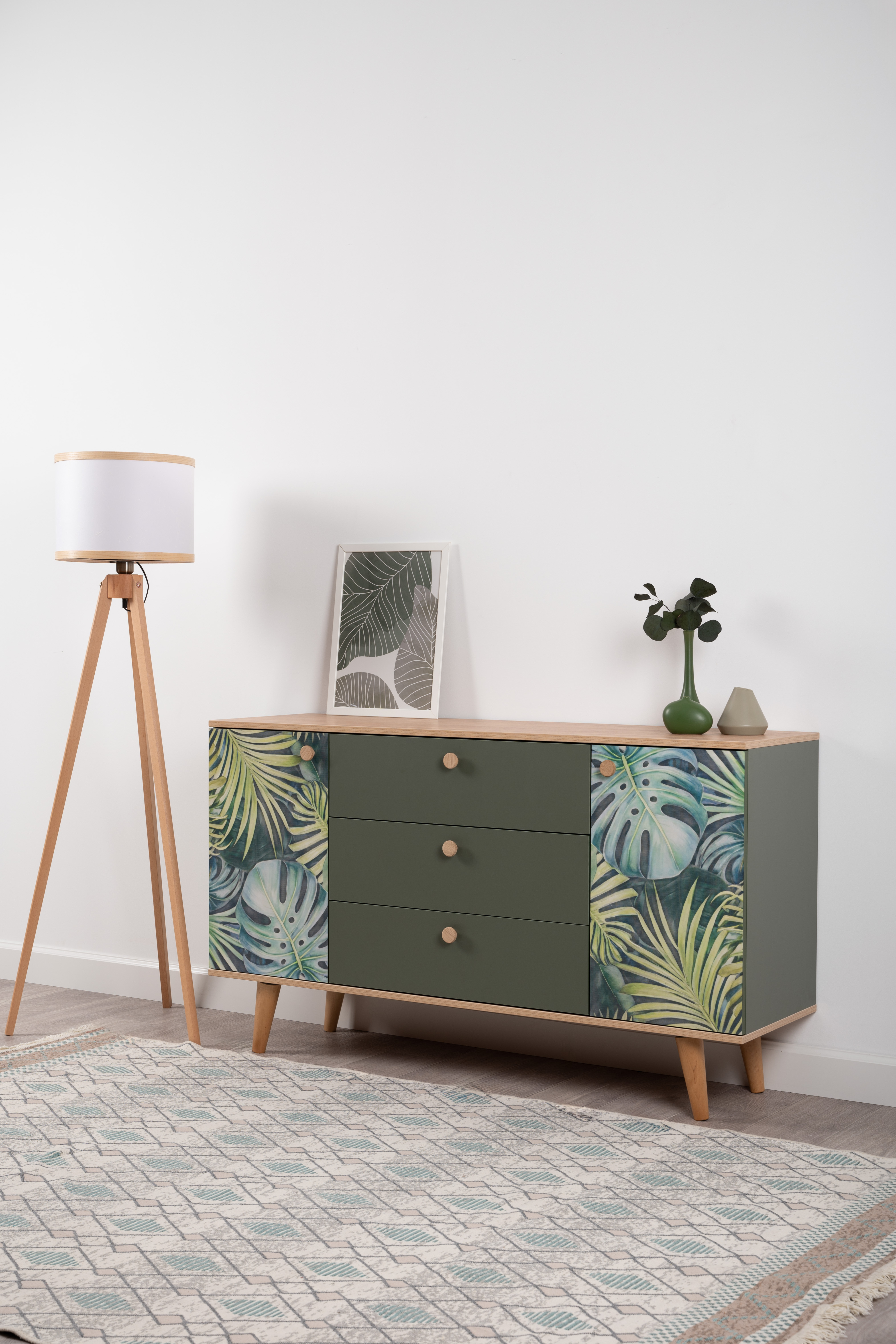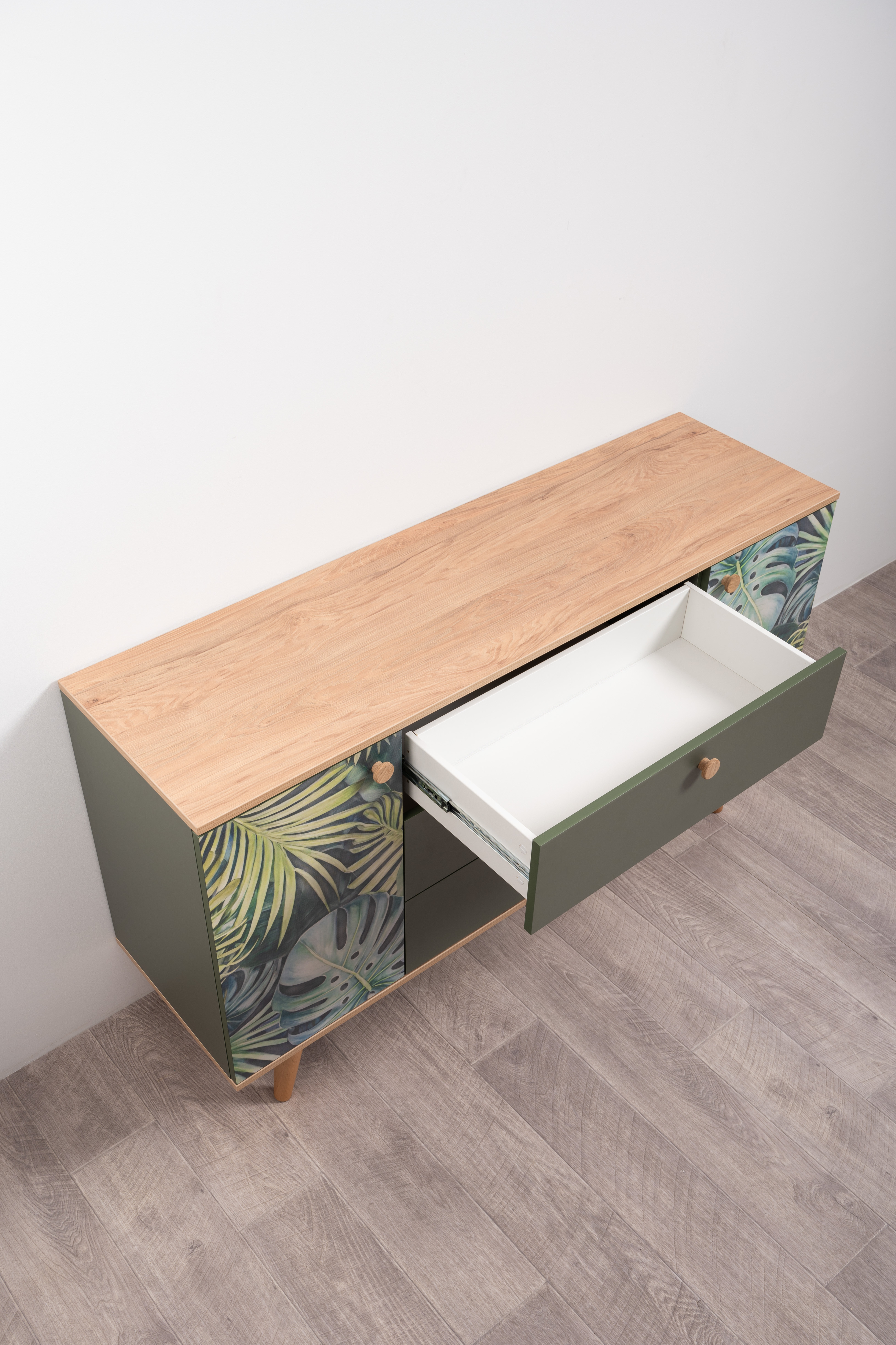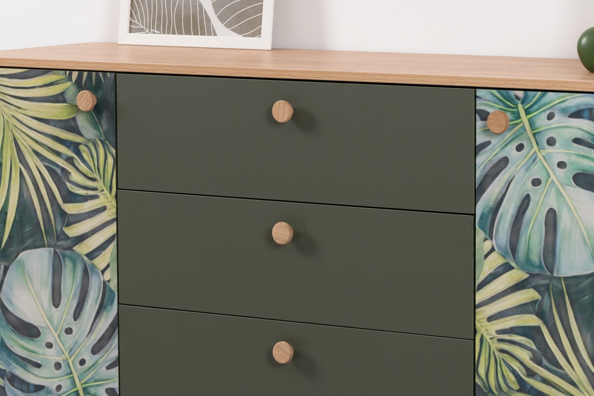 Комод Маттиас 16.245 дымчатый зеленый K521, гикори рокфорд натуральный KO86 PW, белый PE шагрень, фотопечать