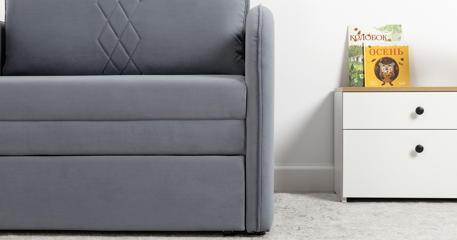 Стильный компактный диван для детской и гостиной. При своих скромных размерах он трансформируется в полноценное спальное место для детей и подростков. Лаконичный дизайн в виде декоративной стежки подчеркивает фактуру велюра, а небольшие размеры позволят разместить его в любом пространстве.