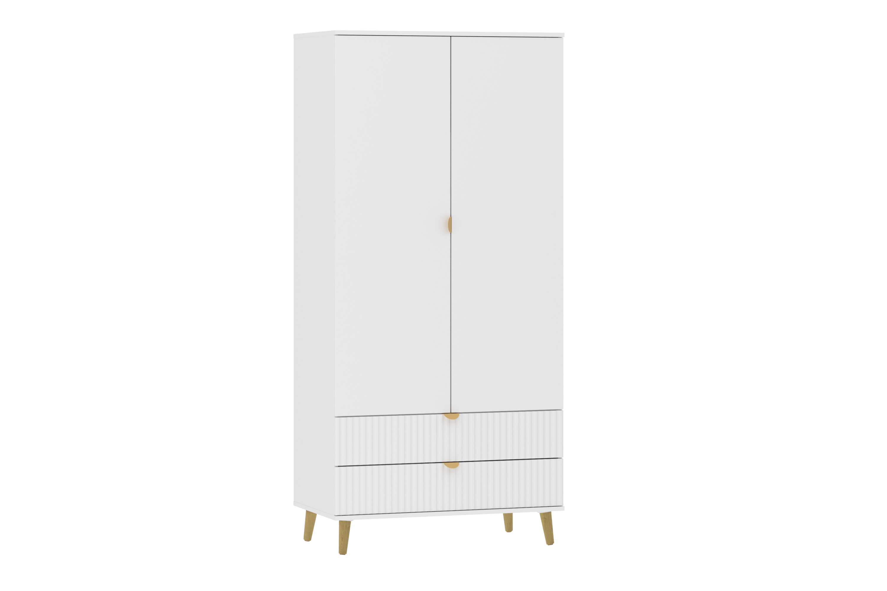 Шкаф оснащен двумя выдвижными ящиками, которые открываются плавно и бесшумно благодаря шариковым направляющим, полками, а также овальной штангой для организации предметов гардероба, а высокие опоры облегчают процесс уборки.