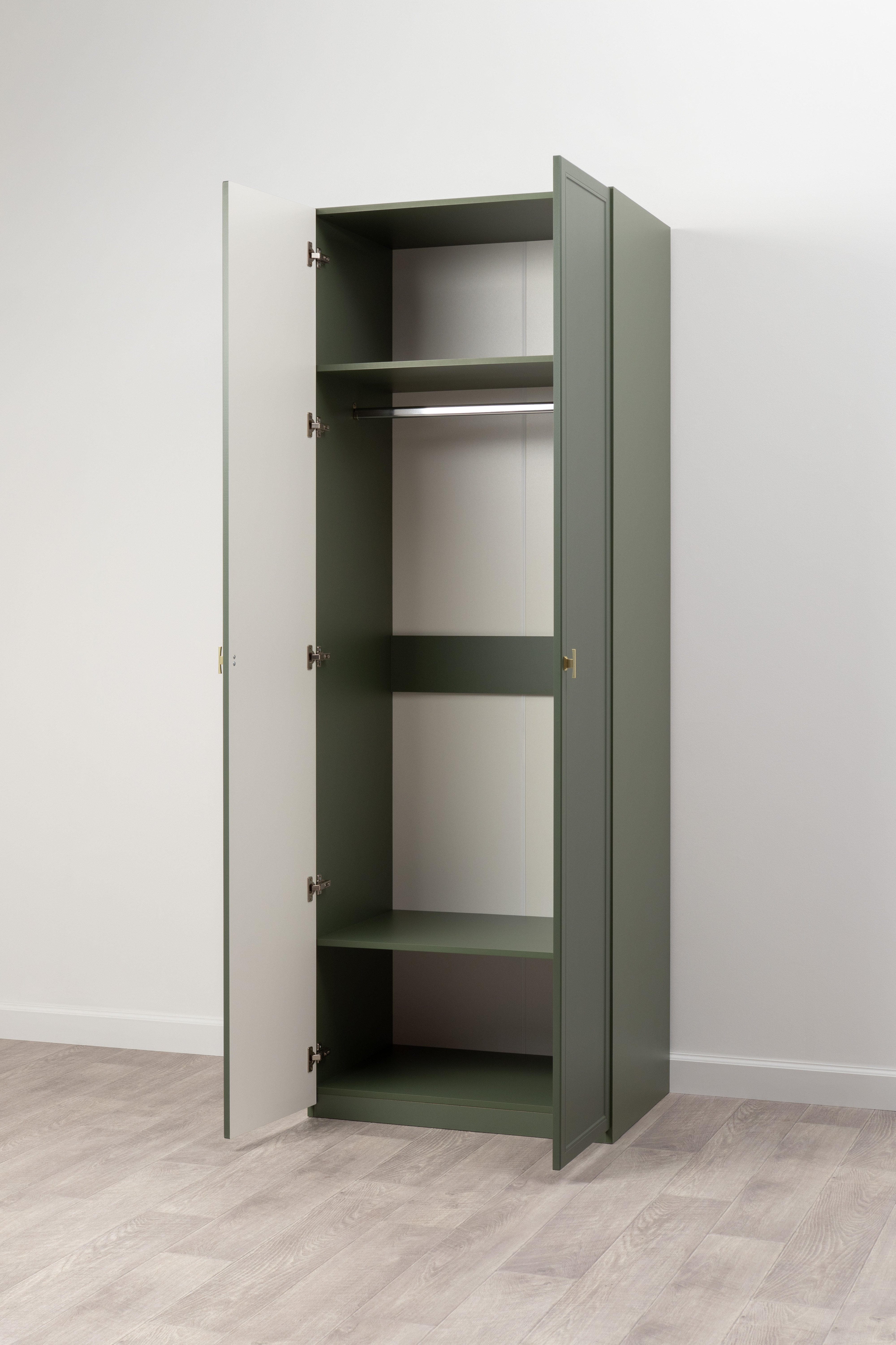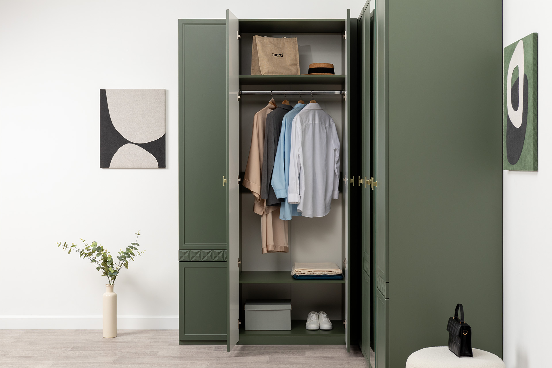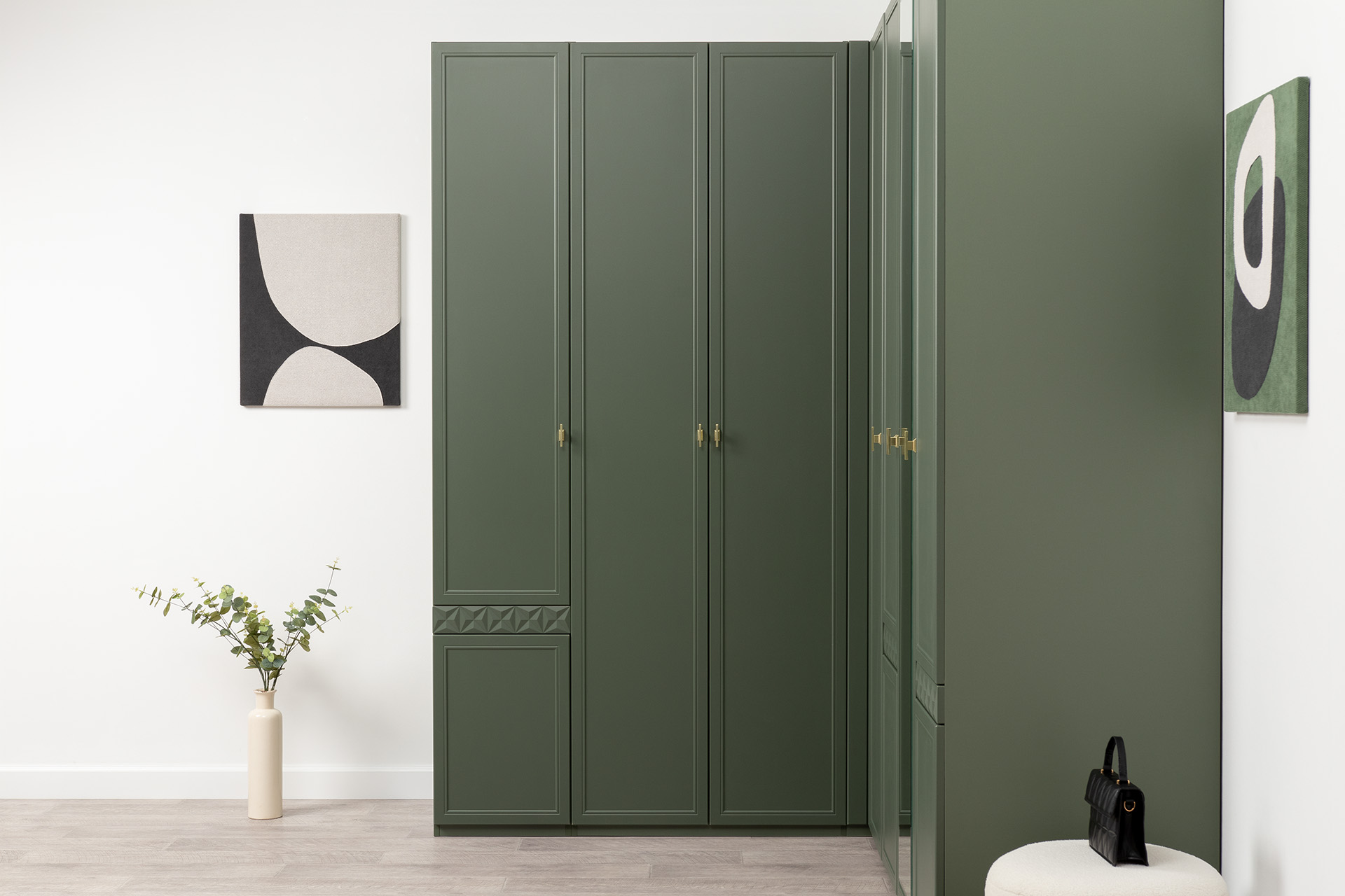 Изящные линии, глубокая фрезеровка фасадов из МДФ и благородные оттенки. Утончённая «Слоновая кость» и изысканная «Олива Шагрень» с глубоким зелёным тоном — создают атмосферу уюта, тепла и благородства. Металлические ручки и опоры золотого цвета придают мебели утончённый блеск, а петли и направляющие с доводчиками обеспечивают плавное и бесшумное закрытие фасадов.