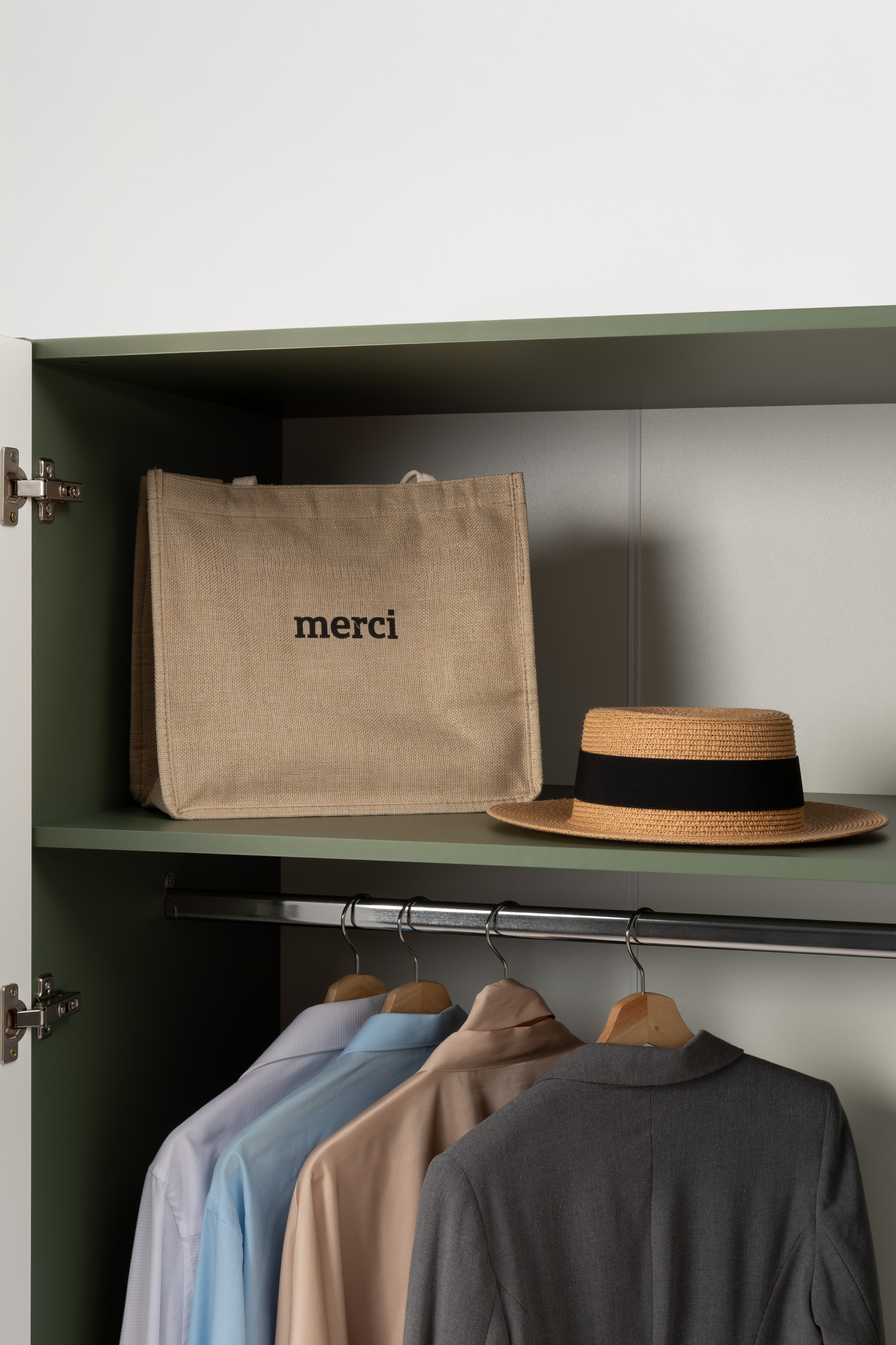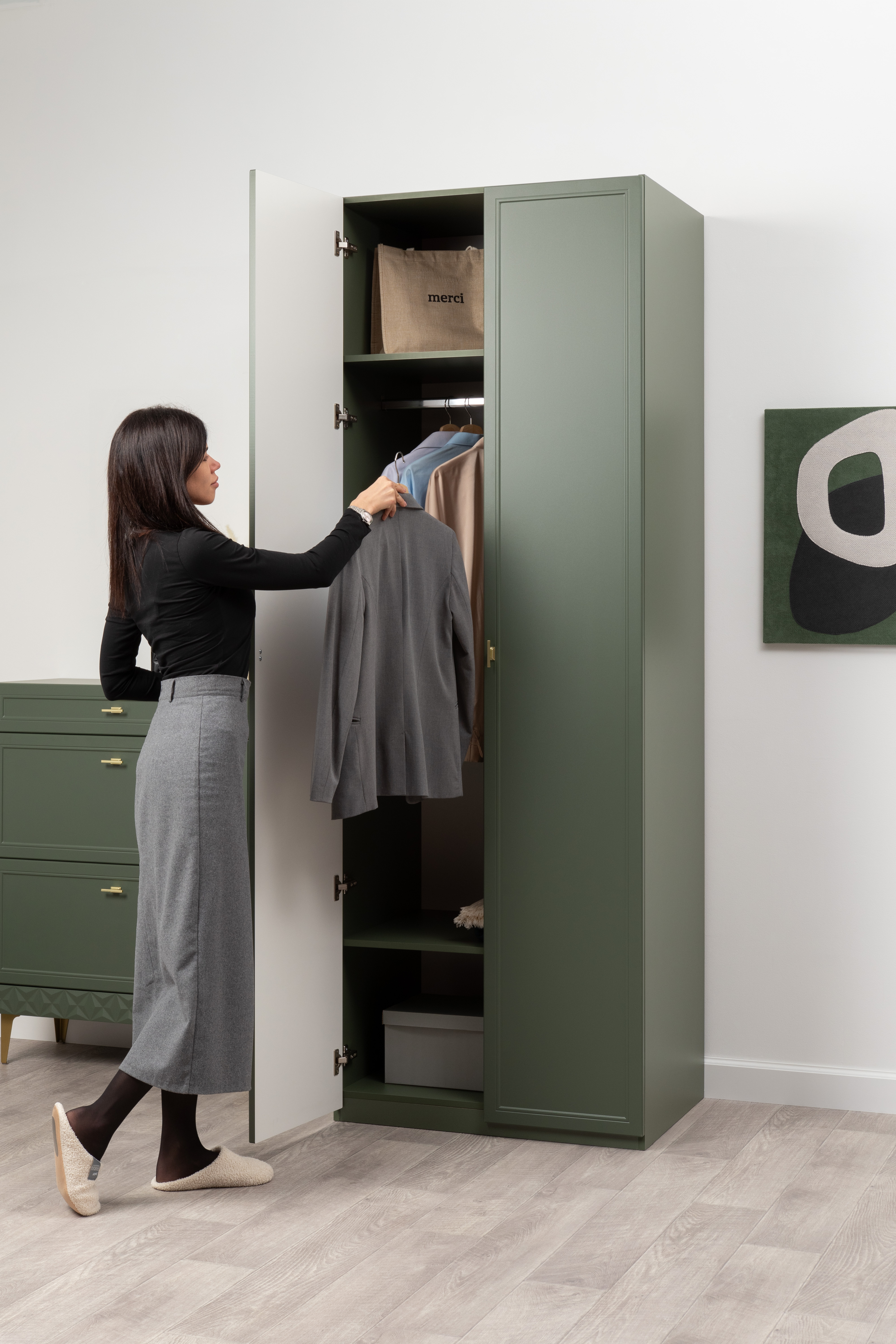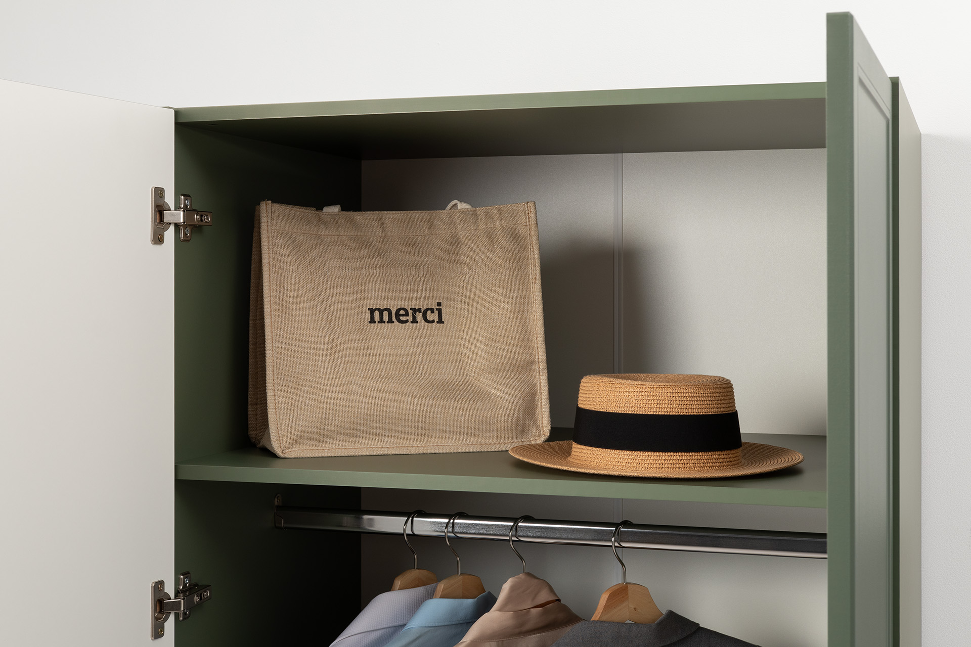 Изящные линии, глубокая фрезеровка фасадов из МДФ и благородные оттенки. Утончённая «Слоновая кость» и изысканная «Олива Шагрень» с глубоким зелёным тоном — создают атмосферу уюта, тепла и благородства. Металлические ручки и опоры золотого цвета придают мебели утончённый блеск, а петли и направляющие с доводчиками обеспечивают плавное и бесшумное закрытие фасадов.