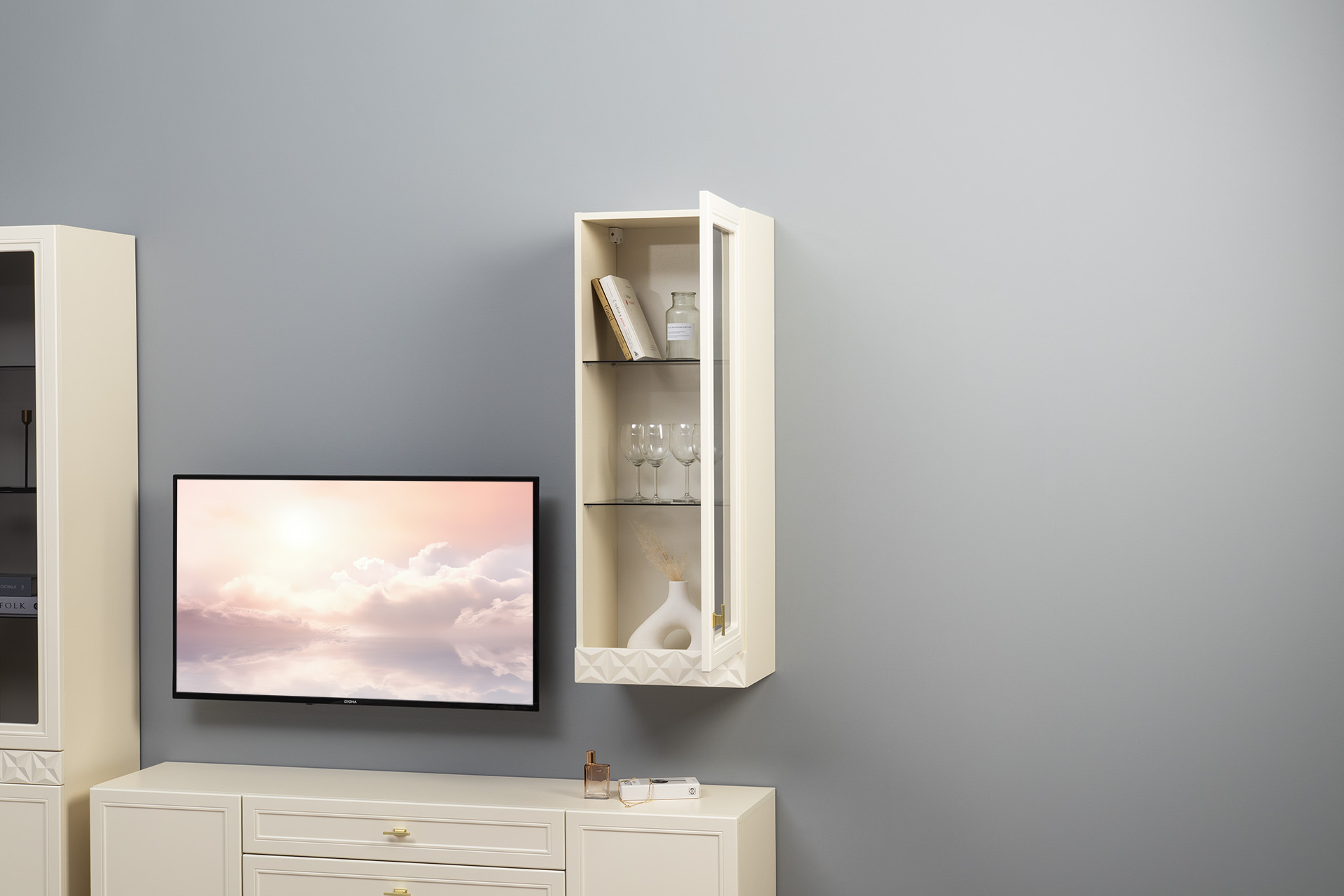 В коллекции представлены три типа витрин с тонированным закалённым стеклом, которые придают пространству лёгкость и свет. «Марион» — идеальное сочетание традиций и актуального дизайна в каждой детали.
