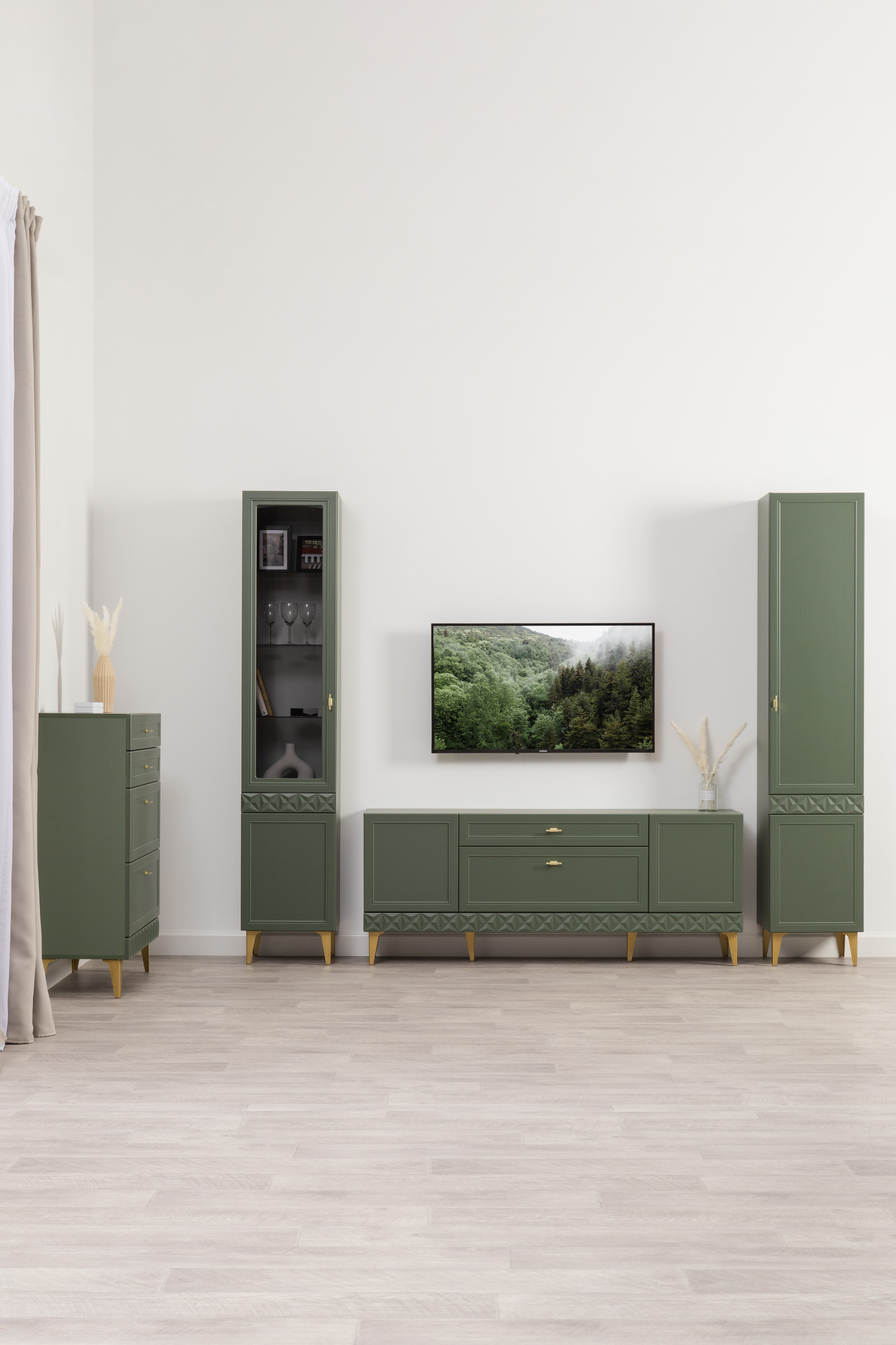 Шкаф-витрина Марион 16.397.01 дымчатый зеленый K521, олива шагрень AG 1050 ПВХ (собирается на любую сторону)