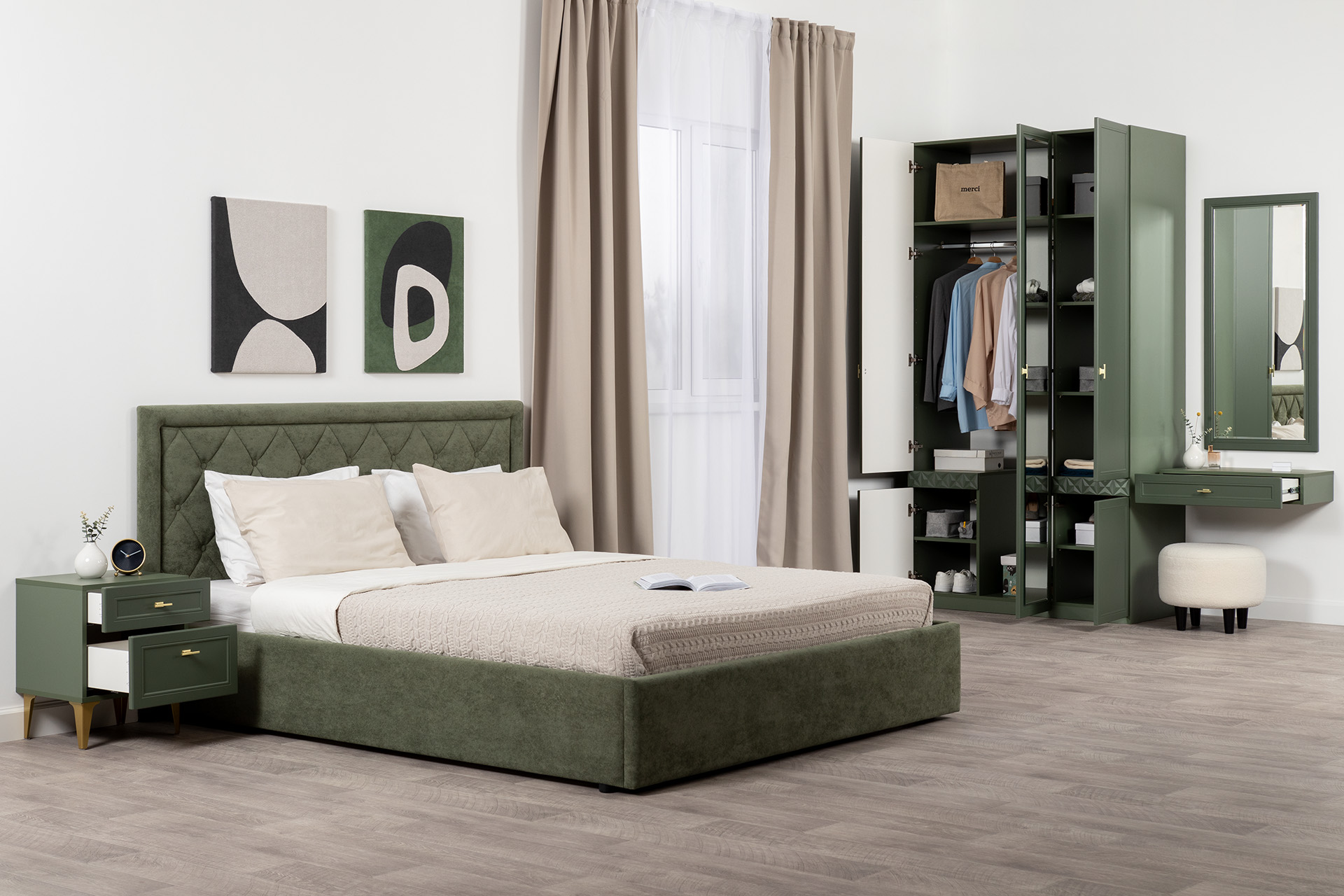 Изящные линии, глубокая фрезеровка фасадов из МДФ и благородные оттенки. Утончённая «Слоновая кость» и изысканная «Олива Шагрень» с глубоким зелёным тоном — создают атмосферу уюта, тепла и благородства. Металлические ручки и опоры золотого цвета придают мебели утончённый блеск, а петли и направляющие с доводчиками обеспечивают плавное и бесшумное закрытие фасадов.
