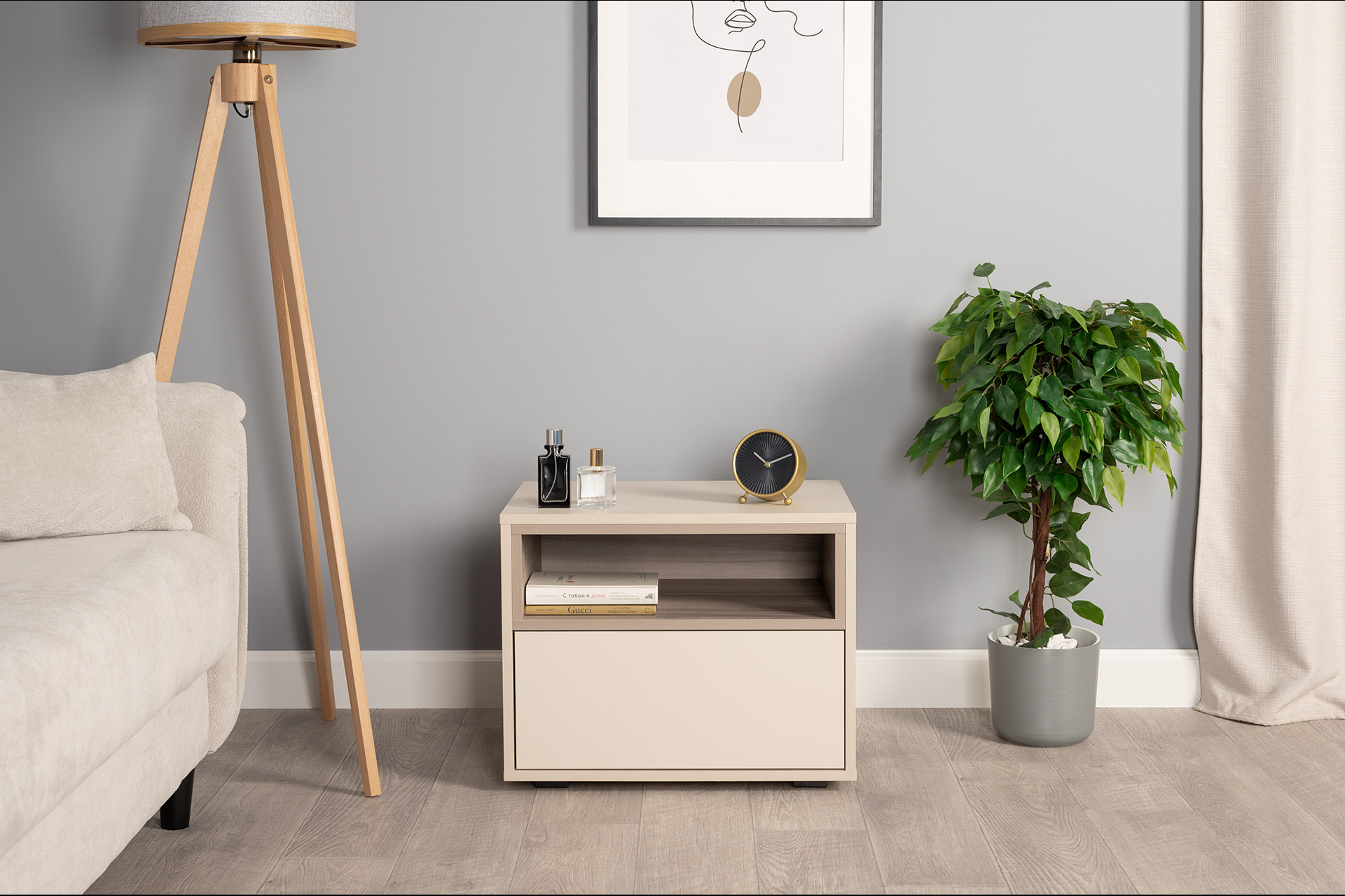Благодаря нейтральному светлому оттенку и универсальности декора модули можно разместить в спальне, гостиной, прихожей.
