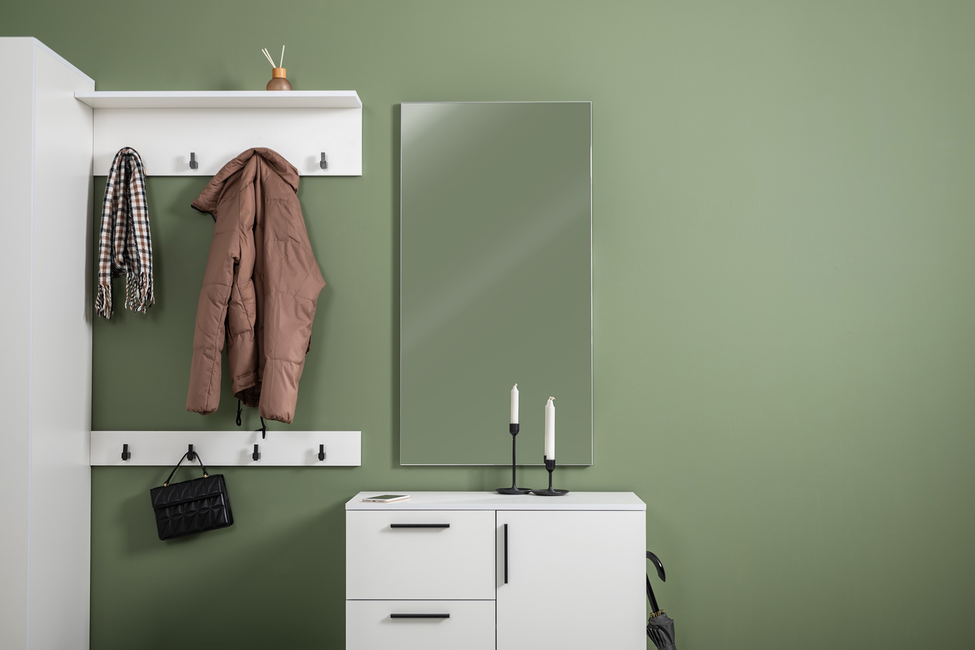 Вместительный шкаф полноразмерной глубины можно дополнить тумбой для обуви с мягким сиденьем и нишами для хранения, зеркалом и минималистичными вешалками.